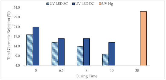 Figure 7 depicts the curing related cosmetic rejections from the lenses produced by UV LED and UV Hg. Generally, the rejection of lenses cured by UV LED decreased as curing time increased from 5 to 10 min. Notably, the UV-LED-cured lenses showed a 20–50% improvement compared to UV Hg, starting at around 8 min for UV LED SC and 6.5 min for UV LED DC. This trend strongly supports the observation seen in DOC as demonstrated in Figure 1. Prolonged curing time is favorable to allow the formulation to achieve optimal curing, provide adequate crosslinking between polymer chains, enhance the strength of the lenses, and, thus, minimize the strength-related defects during the manufacturing process [31,32].