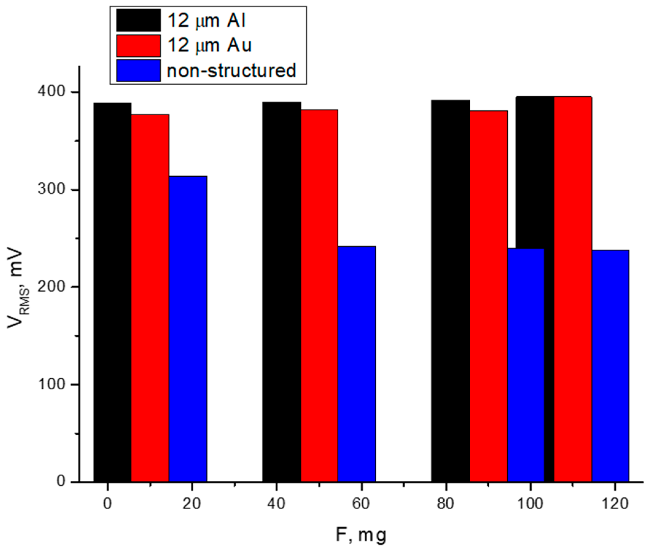 | F [mg] | 12 μm Al Electrode [mV] | 12 μm Au Electrode [mV] | 12 μm Non-Structured [mV] |