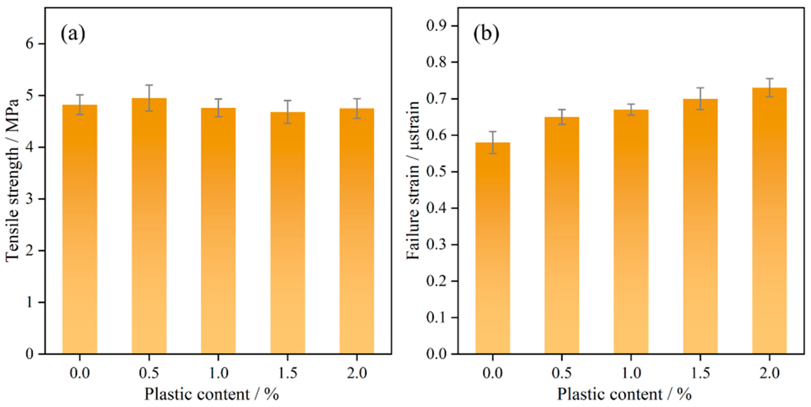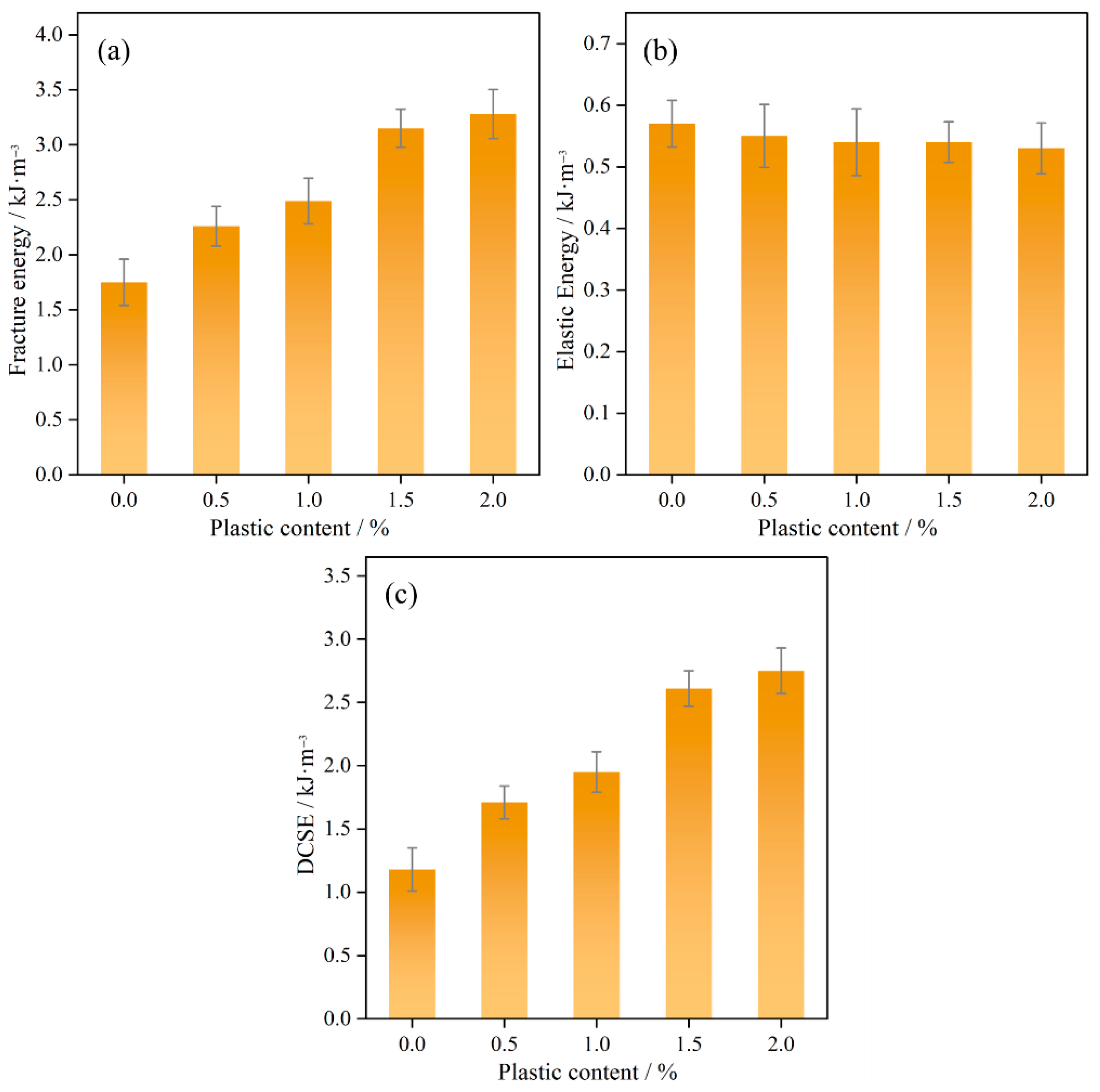 - In contrast, the failure strain, fracture energy, and maximum DSCE increased by 25.86%, 87.43%, and 133.05%, respectively. Adding up to 2% plastic (by aggregate weight) improves toughness and cracking resistance, increasing dissipated energy during crack propagation.