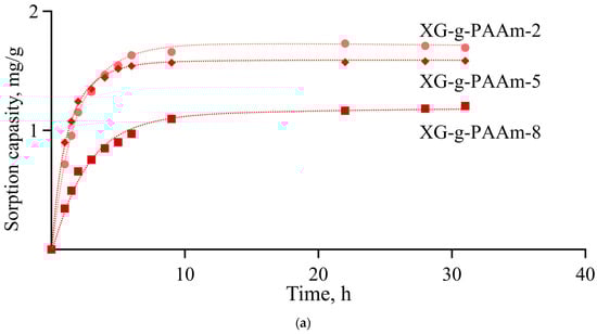 Unfortunately, at this stage it seems impossible to split the Khamizov constant K2 into two terms corresponding to the pseudo-second order of chemisorption, on the one hand, and sorbate consumption, on the other hand (except for the indisputable case of XG-g-PAAm-3). This will be done later, after plotting the sorption isotherms and determining the maximum sorption degree of the copolymer.