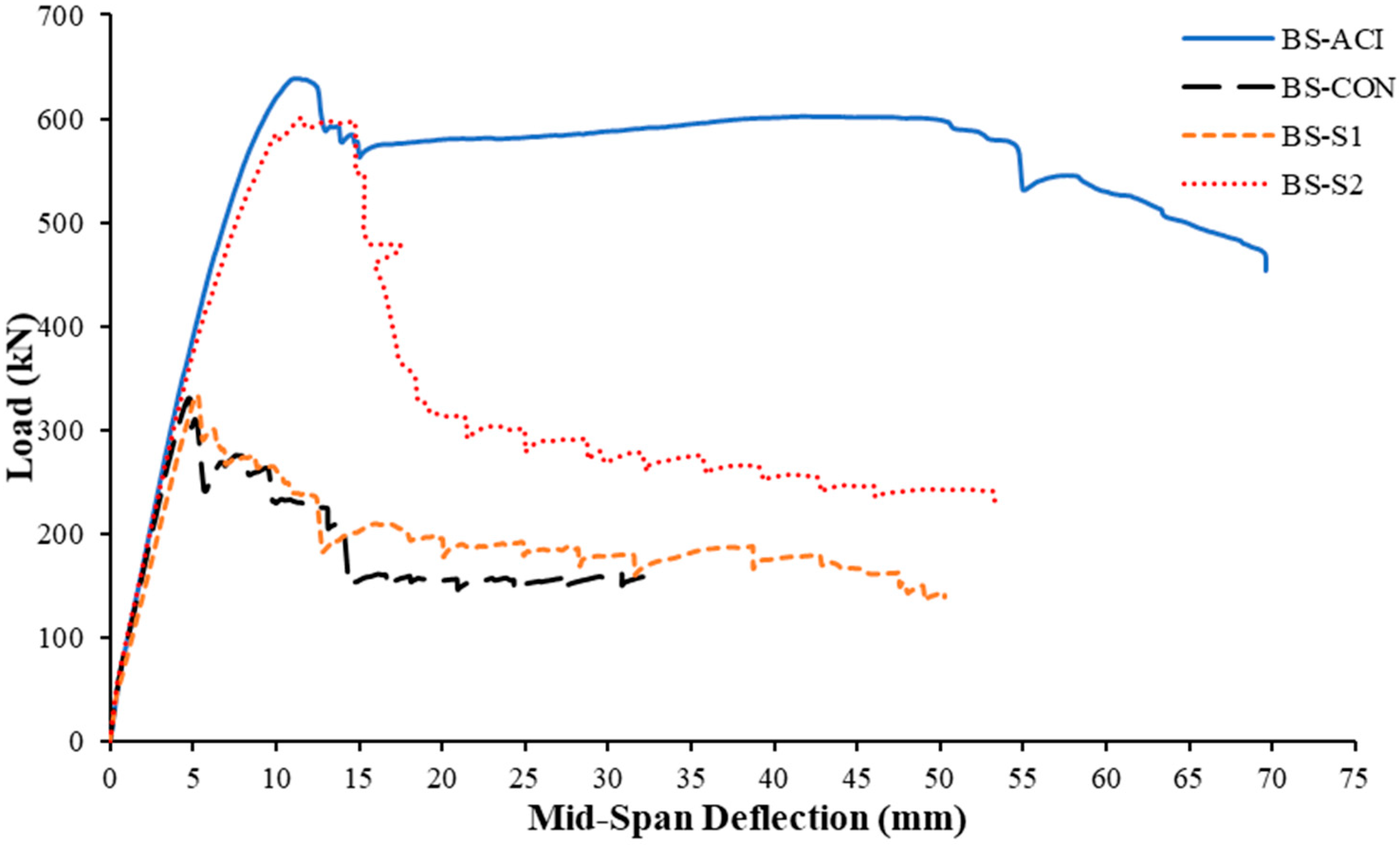 - The failure mode observed in the strengthened specimen BS-S1 indicates that the presence of the external steel plates technique had an insignificant influence on the shear resistance of wide beams compared to the control specimen BS-CON, which is deficient in shear. Therefore, it is suggested to add internal stirrups along with external plates.