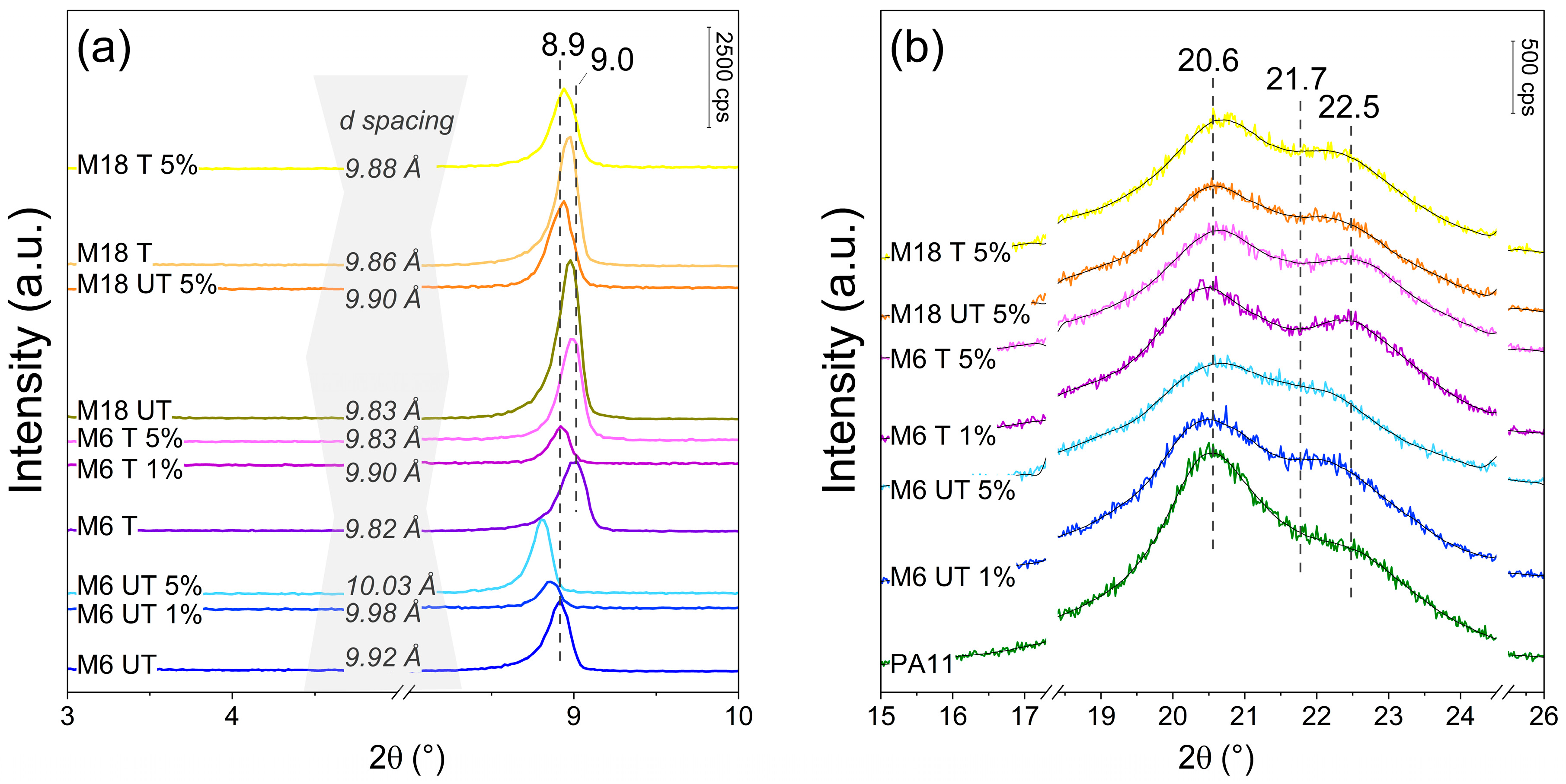 - Wu, T.-M.; Wu, J.-Y. Structural Analysis of Polyamide/Clay Nanocomposites. J. Macromol. Sci. Part B 2002, 41, 17–31. [Google Scholar] [CrossRef]