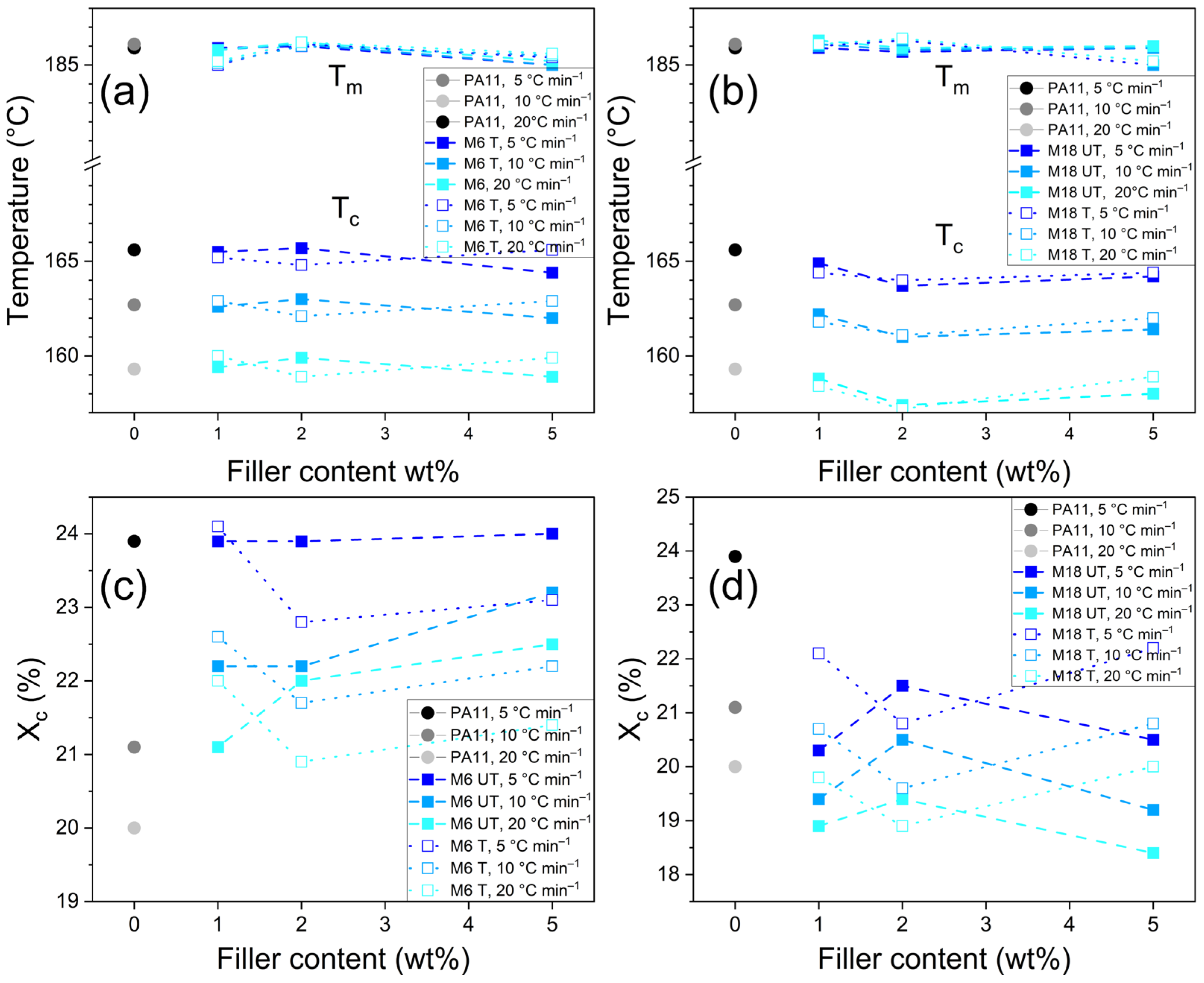 - Jariyavidyanont, K.; Focke, W.; Androsch, R. Crystallization Kinetics of Polyamide 11 in the Presence of Sepiolite and Montmorillonite Nanofillers. Colloid Polym. Sci. 2016, 294, 1143–1151. [Google Scholar] [CrossRef]