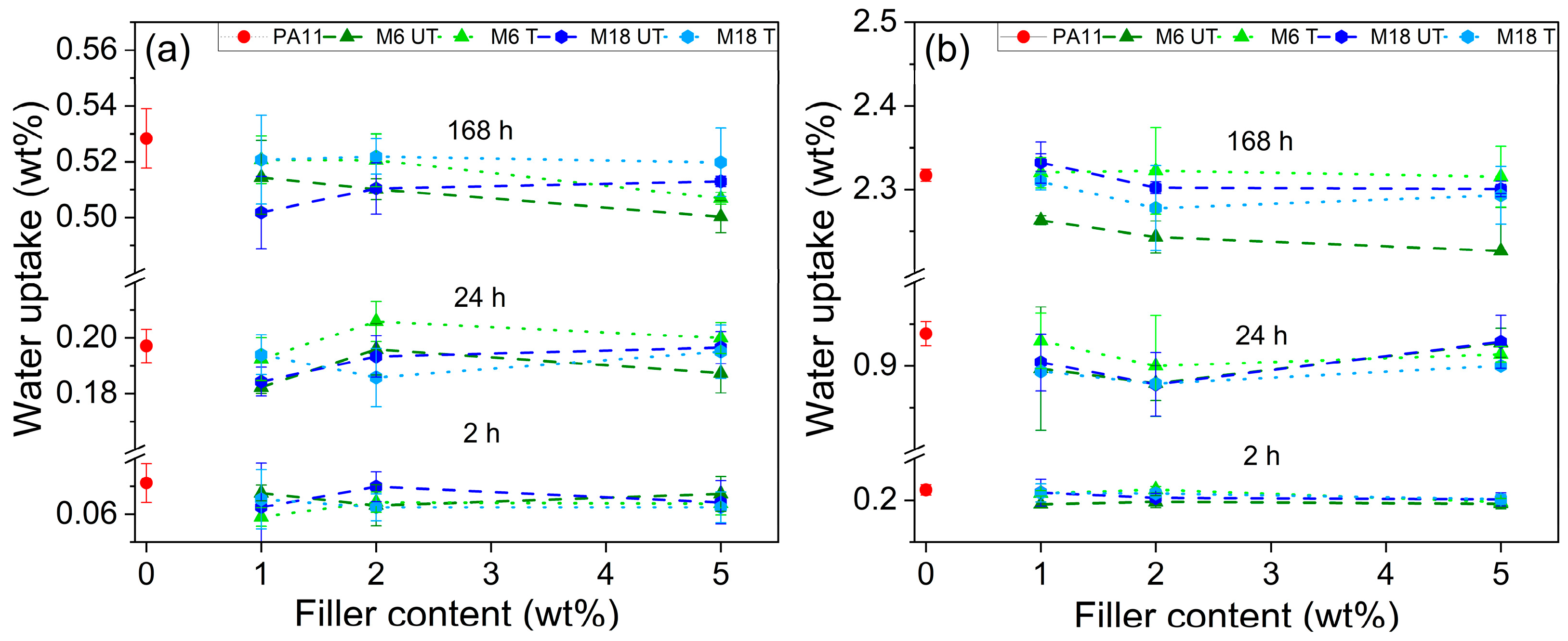 - Bahrami, M.; Abenojar, J.; Martínez, M.A. Comparative Characterization of Hot-Pressed Polyamide 11 and 12: Mechanical, Thermal and Durability Properties. Polymers 2021, 13, 3553. [Google Scholar] [CrossRef]