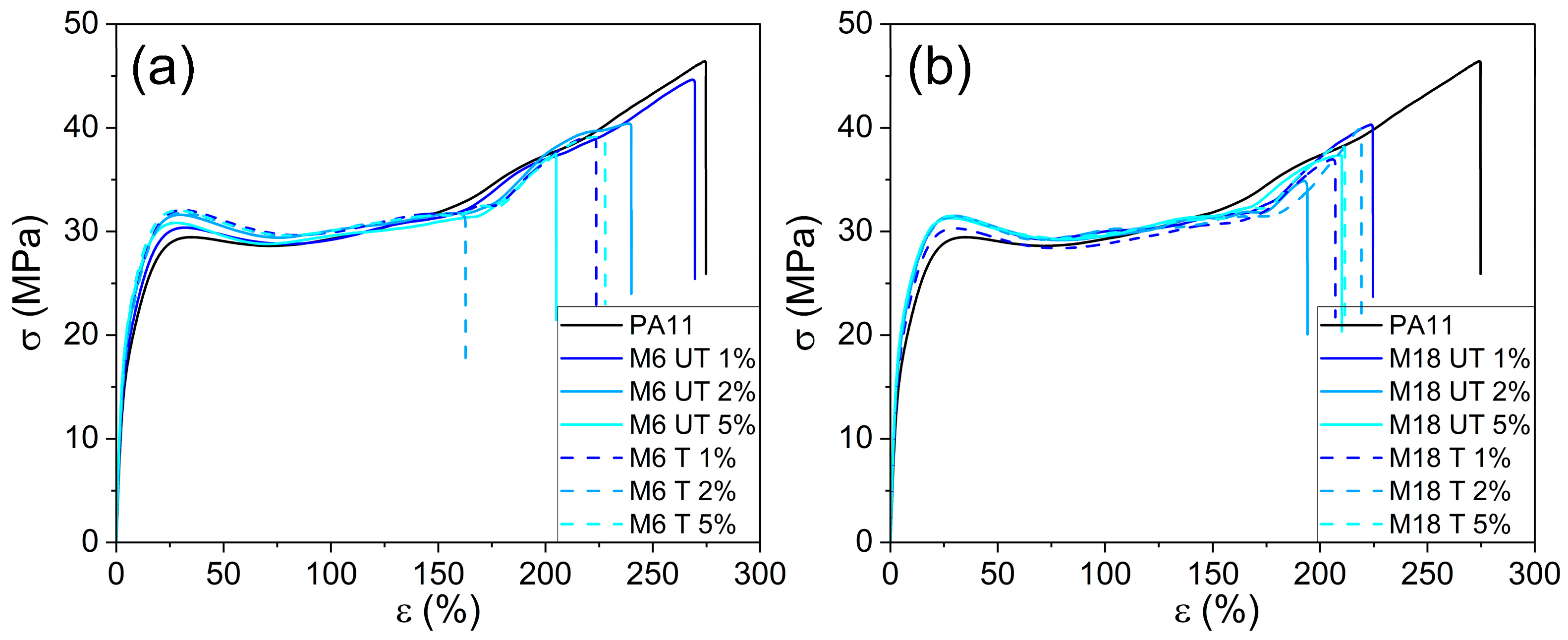 - Mancic, L.; Osman, R.F.M.; Costa, A.M.L.M.; d’Almeida, J.R.M.; Marinkovic, B.A.; Rizzo, F.C. Thermal and Mechanical Properties of Polyamide 11 Based Composites Reinforced with Surface Modified Titanate Nanotubes. Mater. Des. 2015, 83, 459–467. [Google Scholar] [CrossRef]