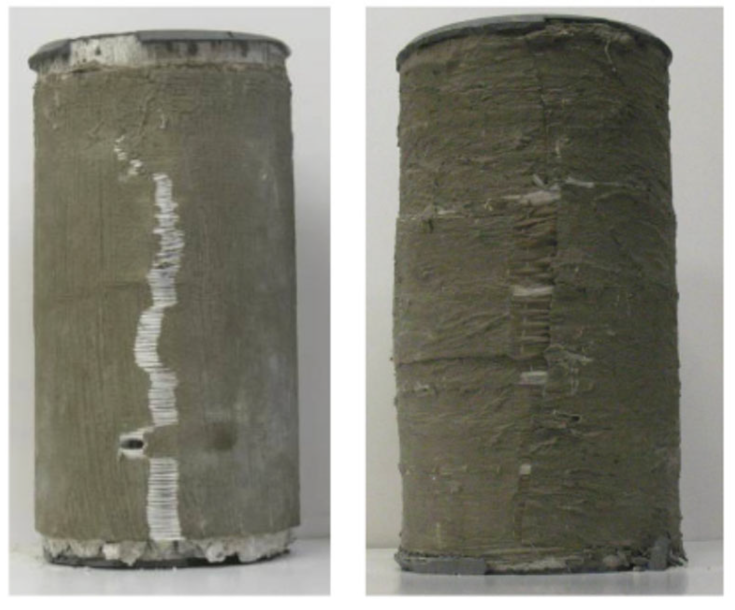 - The failure modes of FRCM-confined specimens were far less abrupt and less explosive compared to those of FRP-confined specimens. This could be attributed to the rupture of individual fiber bundles, which is of a slow progressing nature.