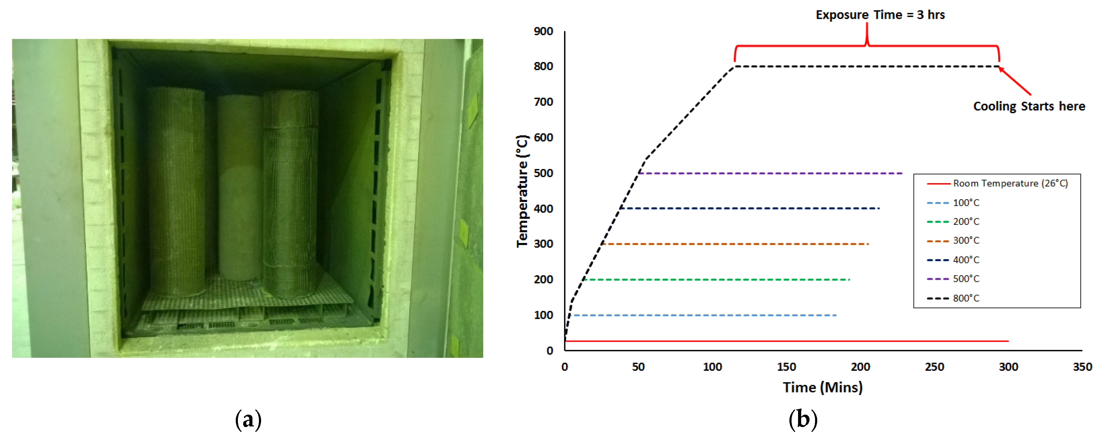 - Al-Salloum, Y.A.; Almusallam, T.H.; Elsanadedy, H.M.; Iqbal, R.A. Effect of elevated temperature environments on the residual axial capacity of RC columns strengthened with different techniques. Constr. Build. Mater. 2016, 115, 345–361. [Google Scholar] [CrossRef]