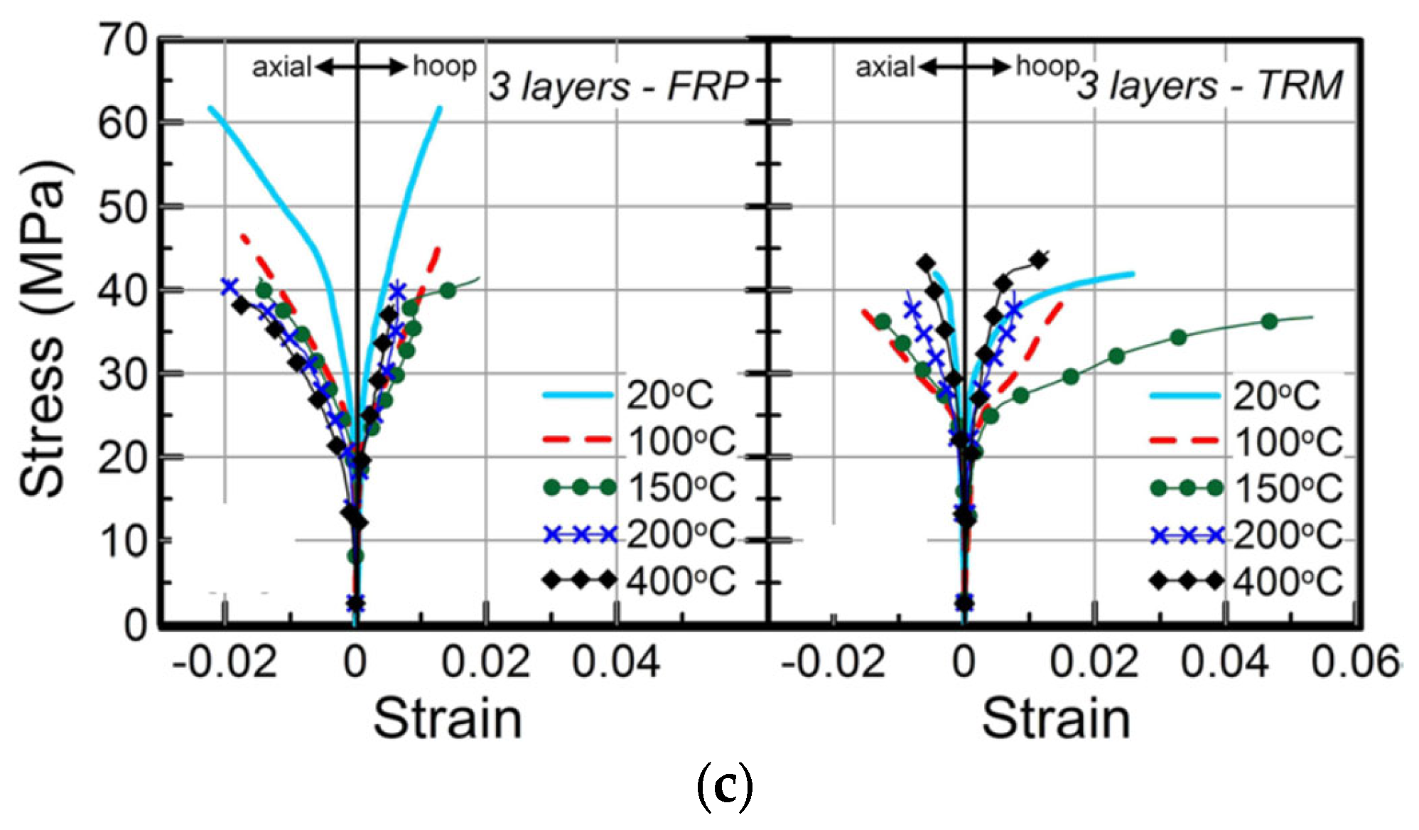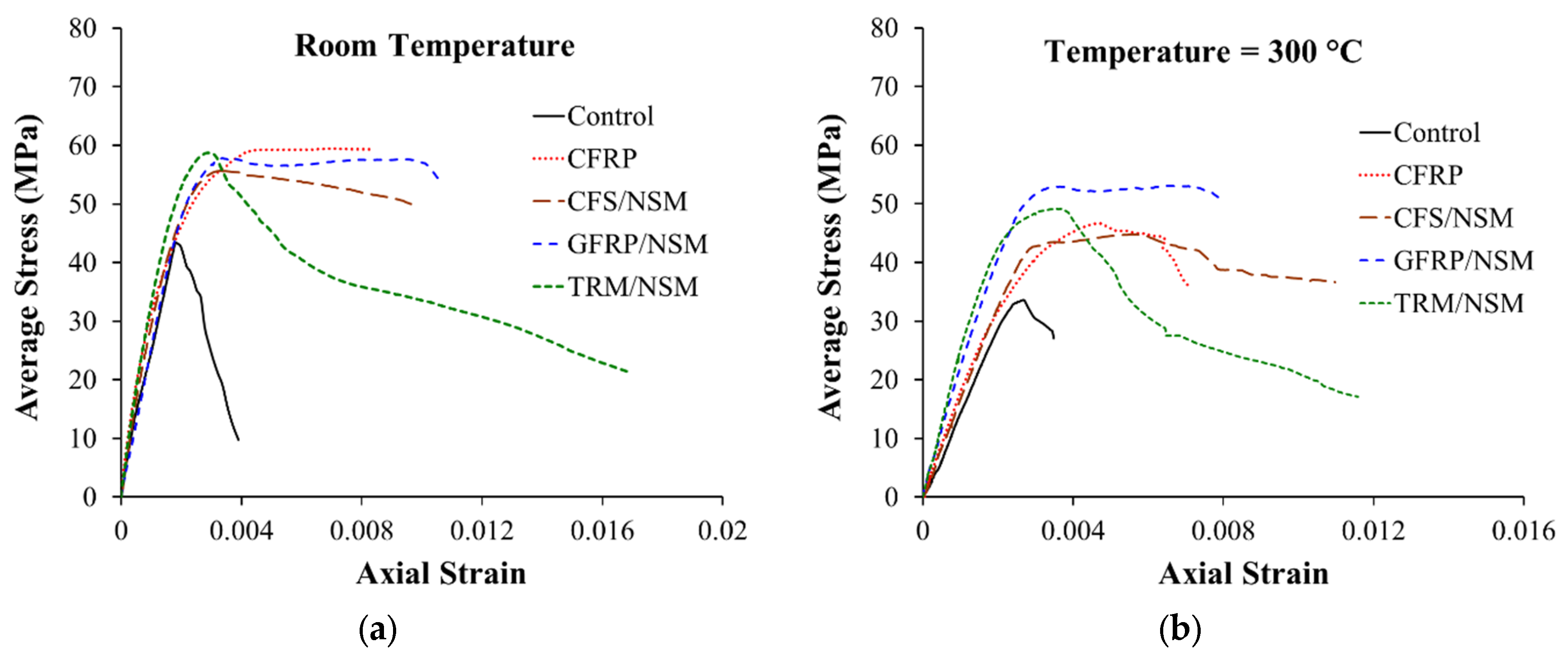 - Compared to its effectiveness at ambient temperatures, FRCM composites display good performance as a confining material even at elevated temperatures, wherein the axial capacity of concrete columns was increased, and an effectiveness ratio of 84% was maintained after exposure to a temperature of 300 °C for 3 h.
