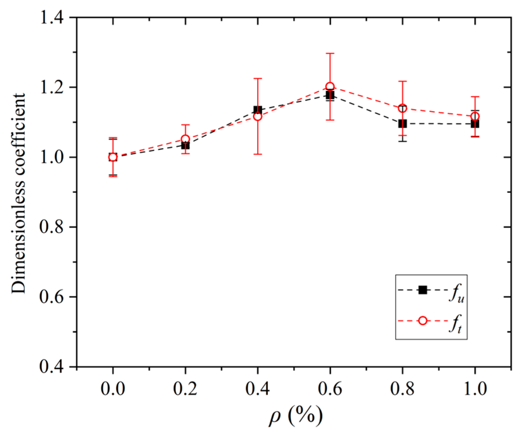 - The fu and ft of SWSSC increased initially and then decreased with increasing POM fiber content, with an optimal fiber volume fraction of 0.6%. At this optimal content, fu increased from 56.4 MPa to 66.4 MPa, and ft increased from 3.06 MPa to 3.68 MPa, representing increases of 17.7% and 20.3%, respectively.