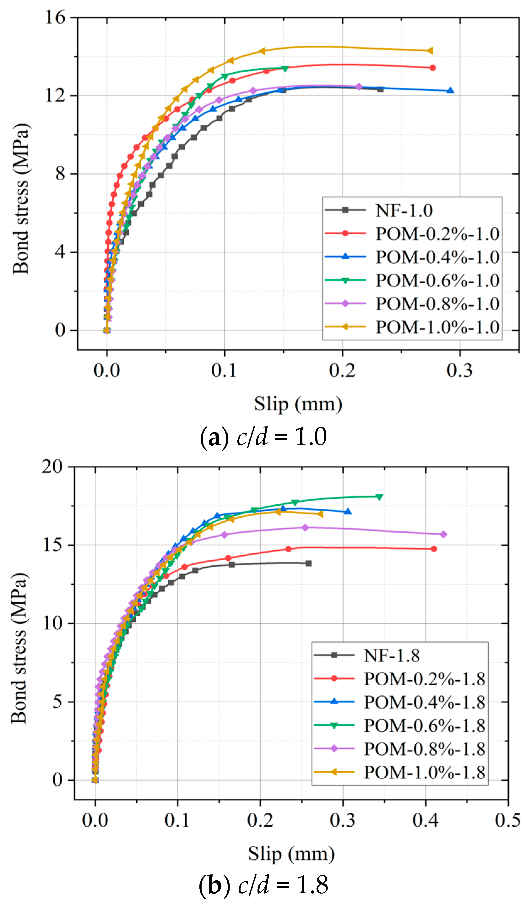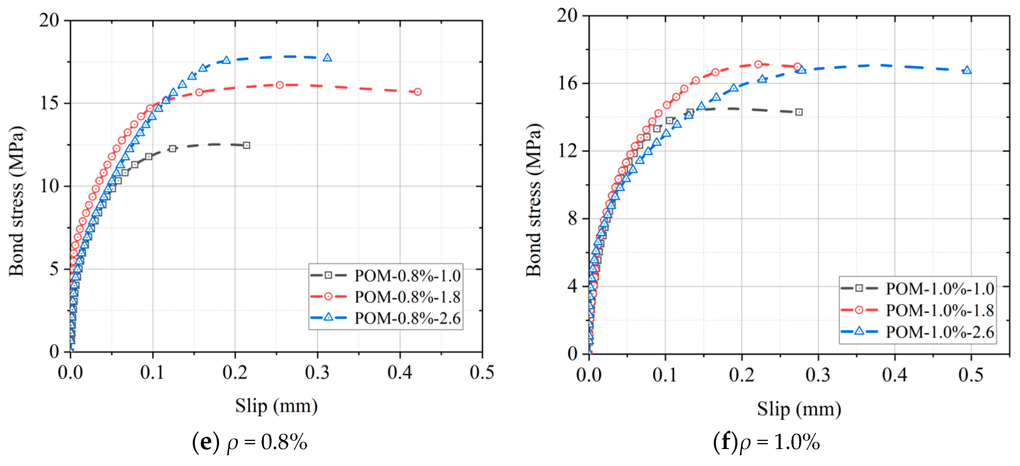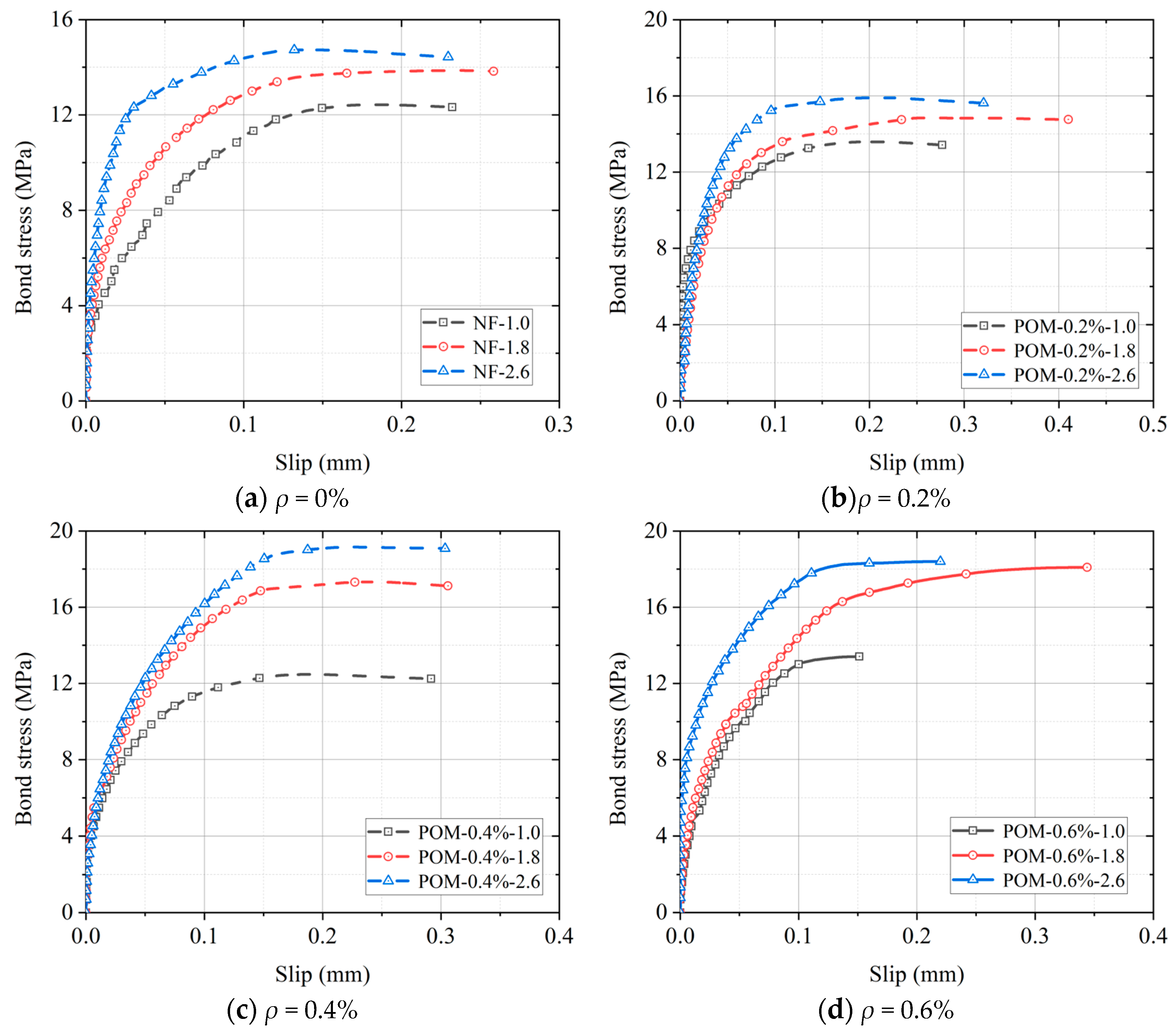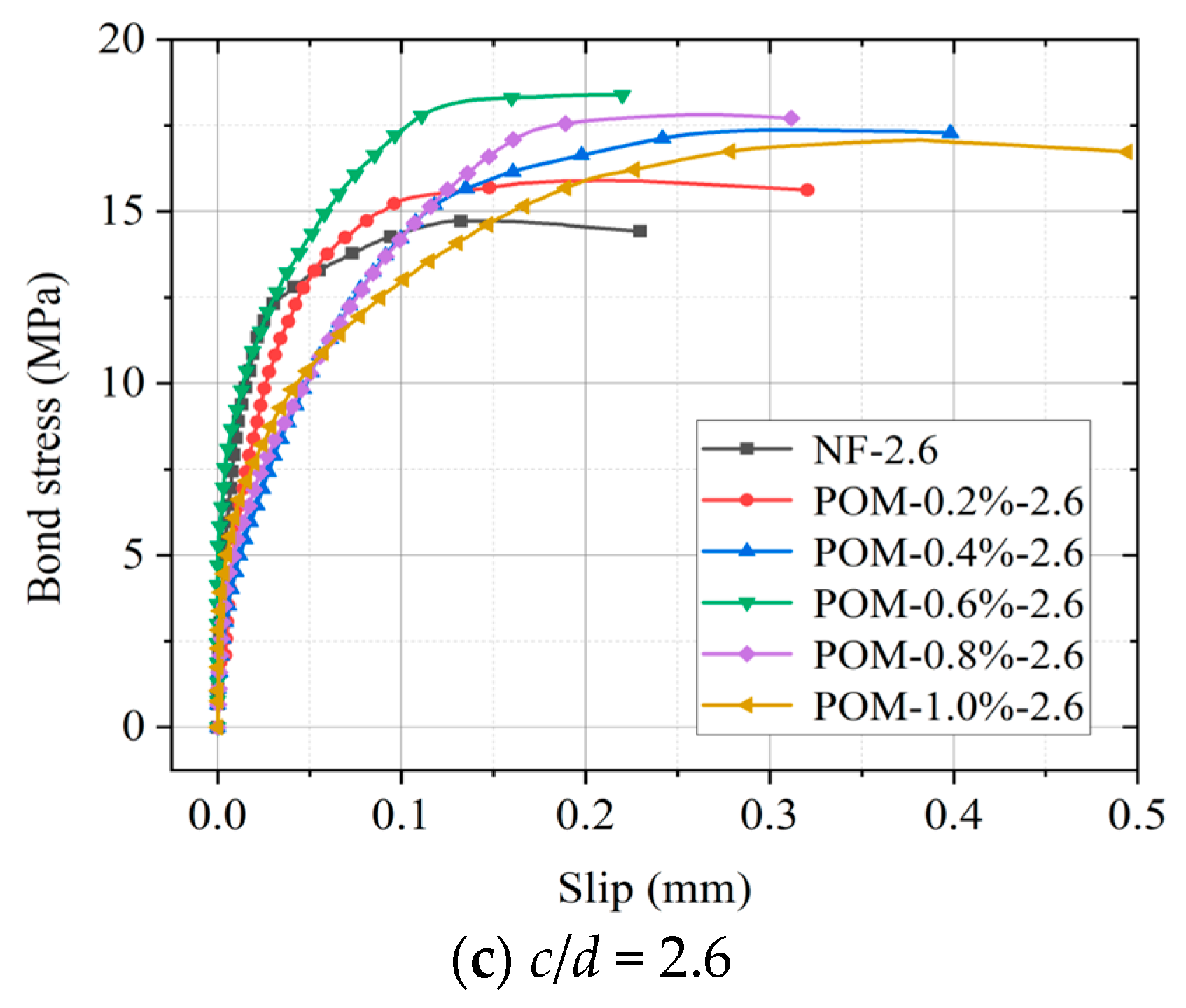 - The bond failure mode of the BSB and POM fiber reinforced SWSSC was splitting failure. Specimens without POM fiber exhibited wider cracks and more severe fragmentation, whereas POM fiber reinforced specimens showed finer cracks and better specimen integrity due to the bridging effect of the fibers. As the c/d increased, the ascending segment of the bond stress–slip curve became steeper.