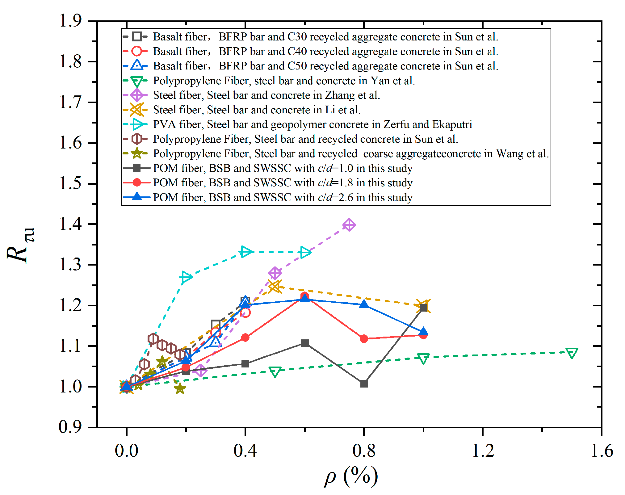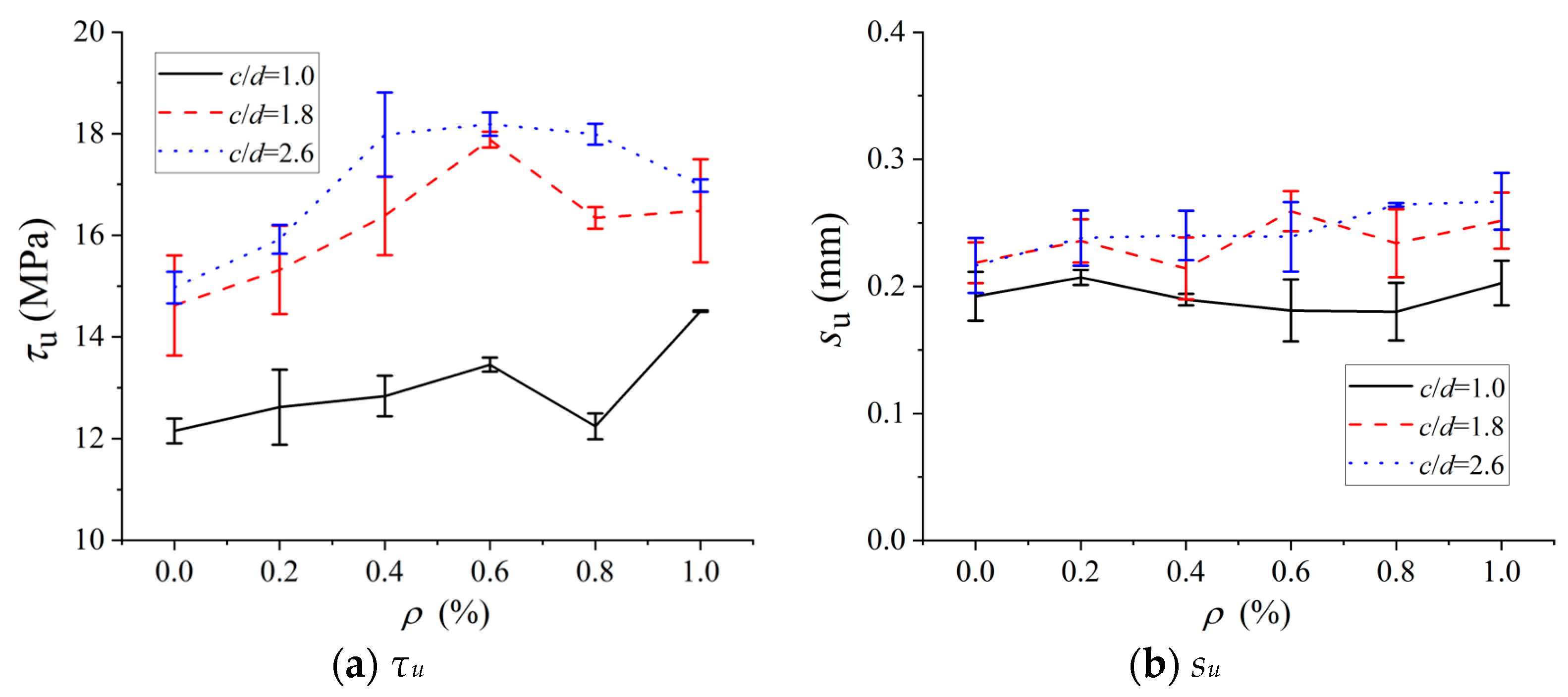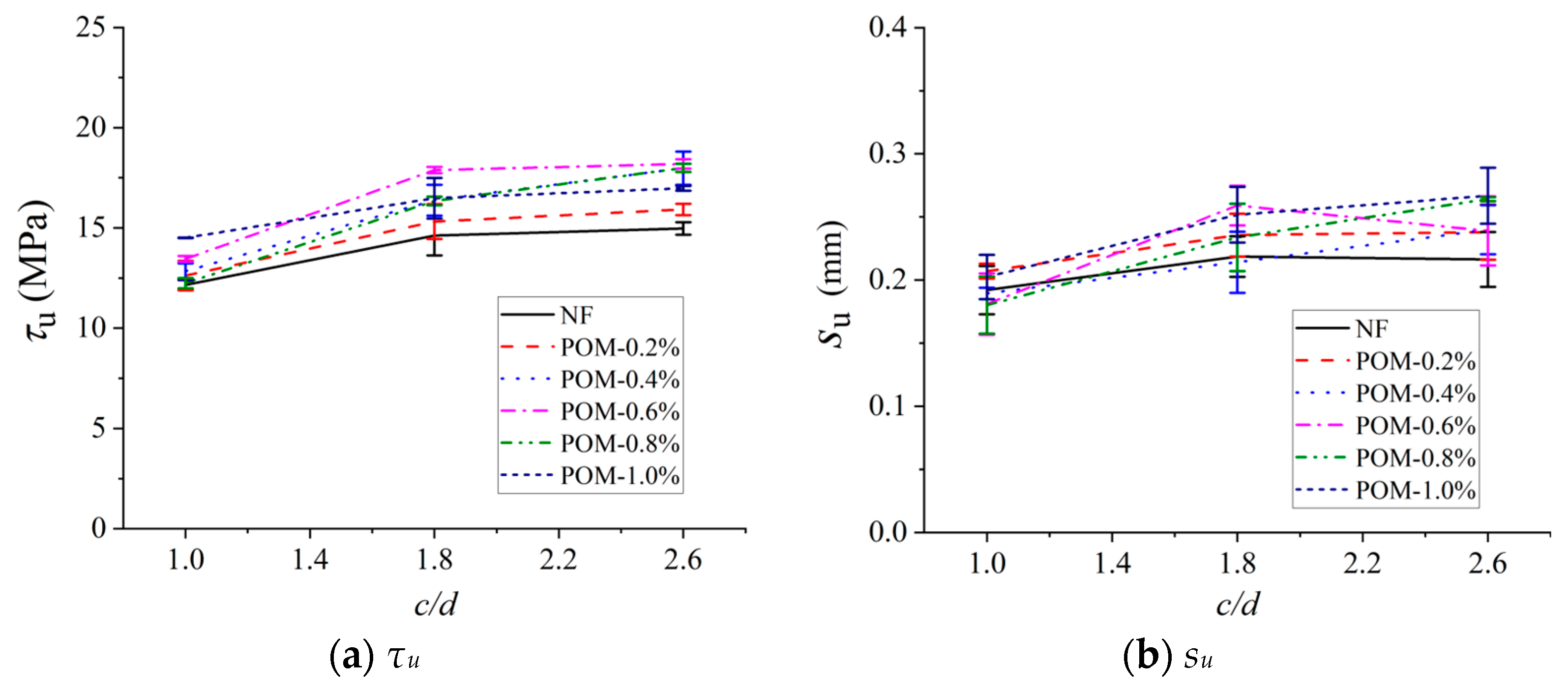 - The τu increased with increasing POM fiber content, reaching its maximum at 0.6%. Beyond this content, the growth of τu slowed down due to fiber agglomeration. Thicker concrete cover effectively resisted the radial expansion force exerted by BSB on the surrounding concrete during pull-out, thereby delaying the splitting failure of SWSSC. τu exhibited a monotonically increasing trend with c/d. Compared to specimens with c/d = 1, those with c/d = 2.6 showed an approximately 35% increase in τu. Notably, su was significantly more sensitive to the cover thickness than to the fiber content.