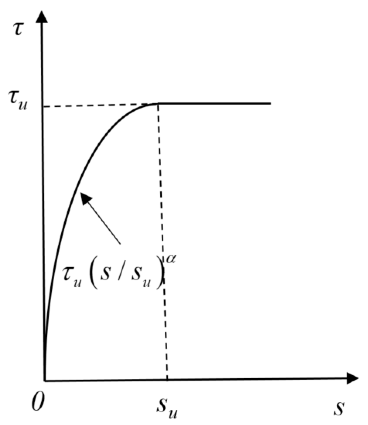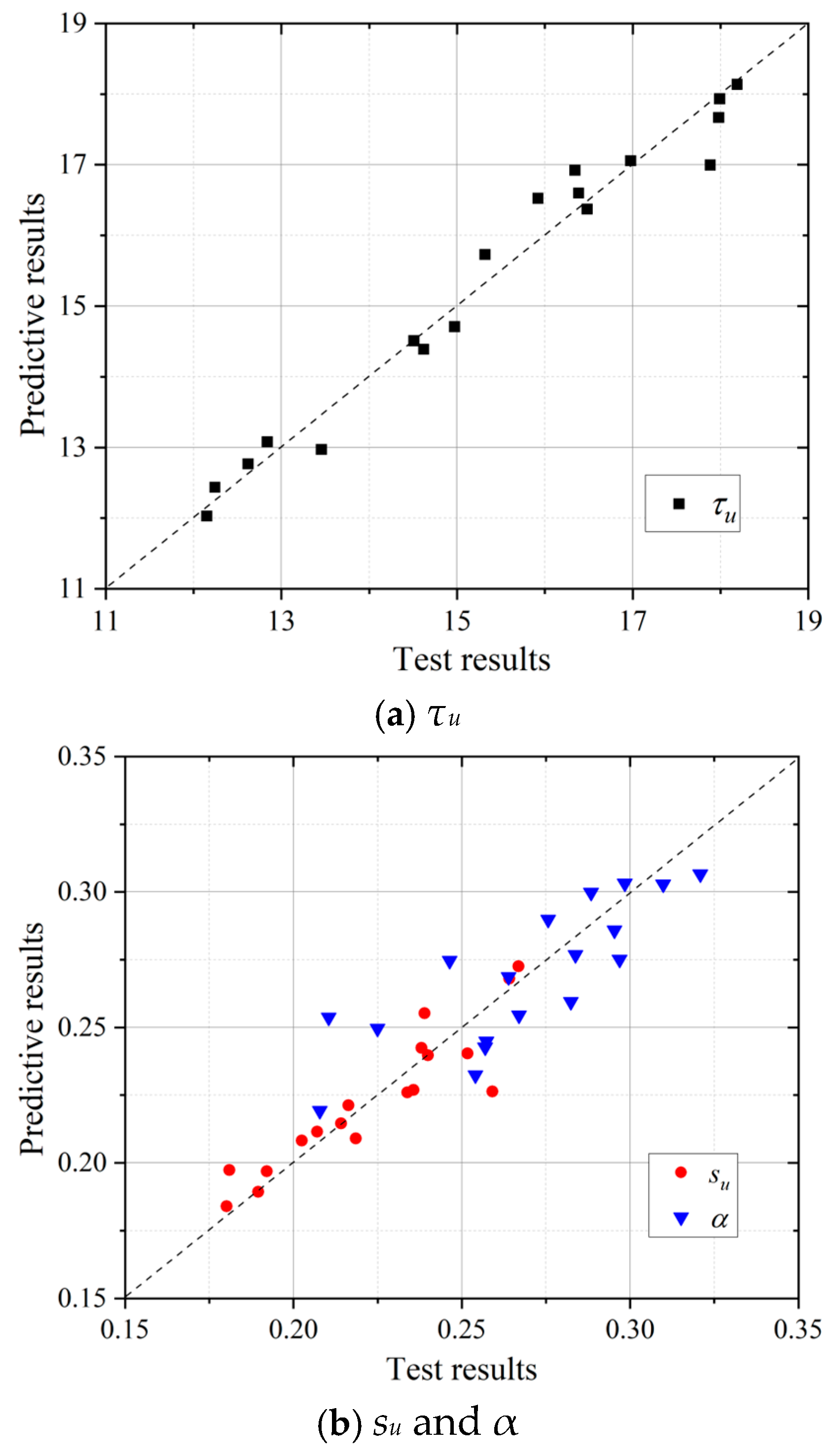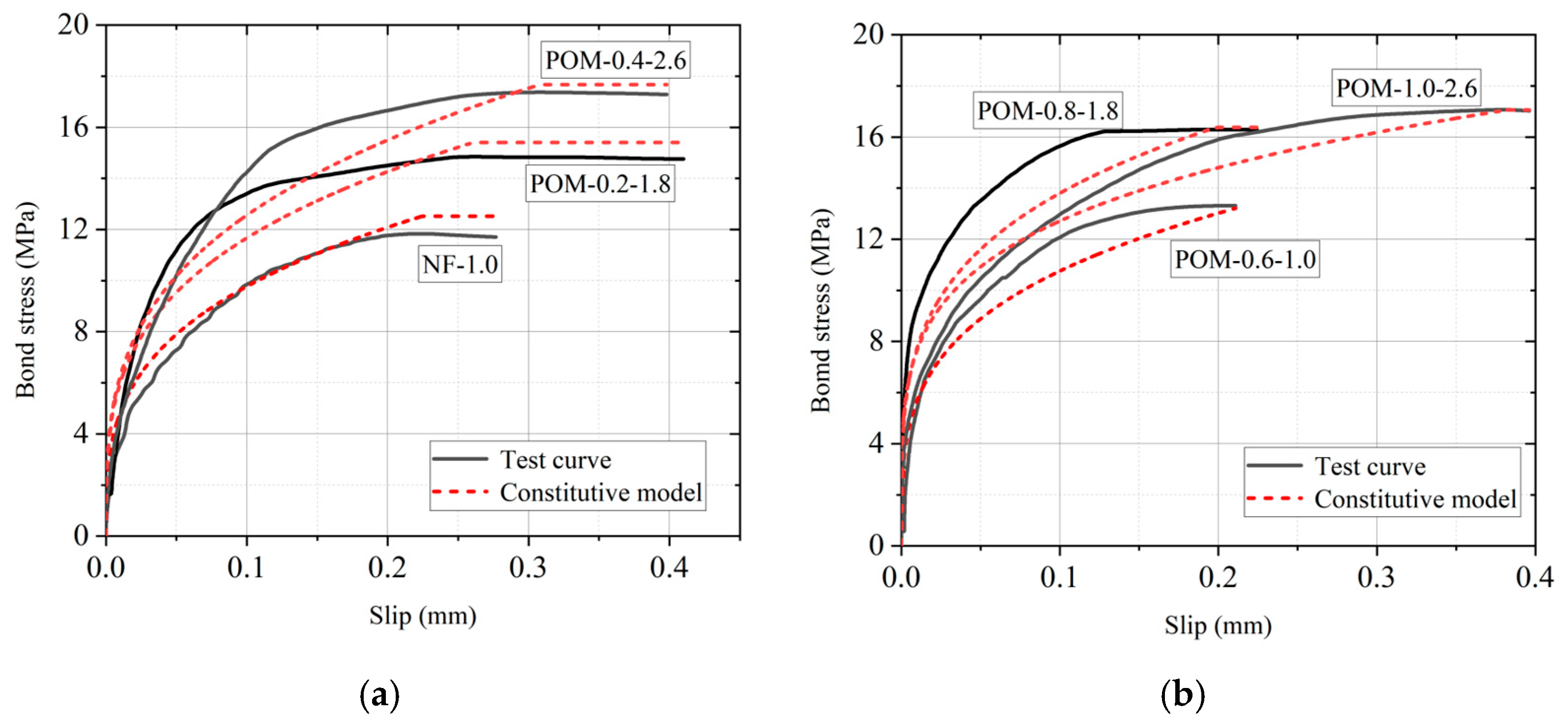 - A predictive mathematical model for key parameters (τu, su, and α) was developed. Based on the bond stress–slip curves obtained from pull-out tests, a piecewise bond stress–slip constitutive model was proposed. By comparing the model-predicted values with the experimental results, it was demonstrated that the proposed model could accurately describe the bond behavior between BSB and POM fiber reinforced SWSSC, providing a theoretical basis for engineering design and numerical simulation.
