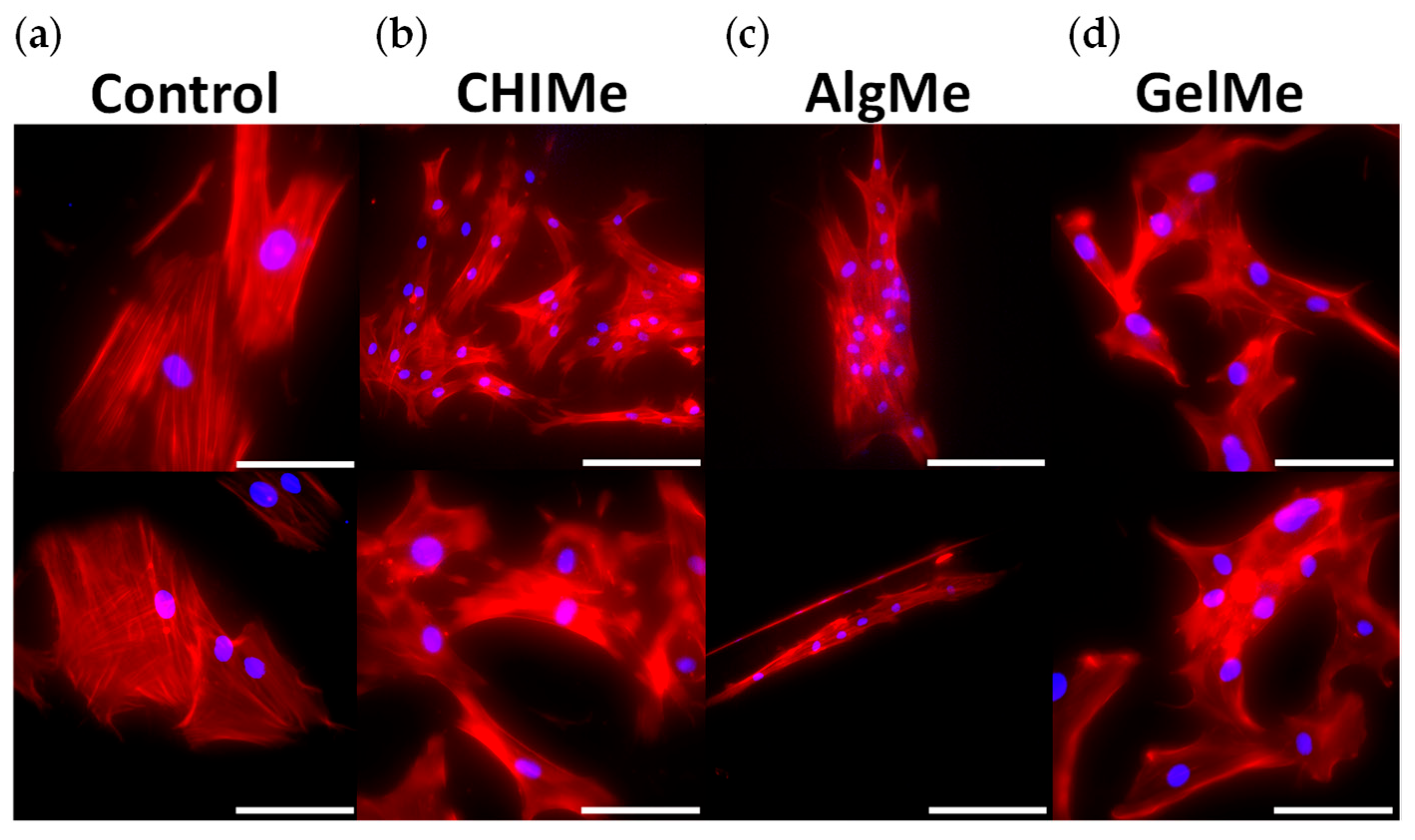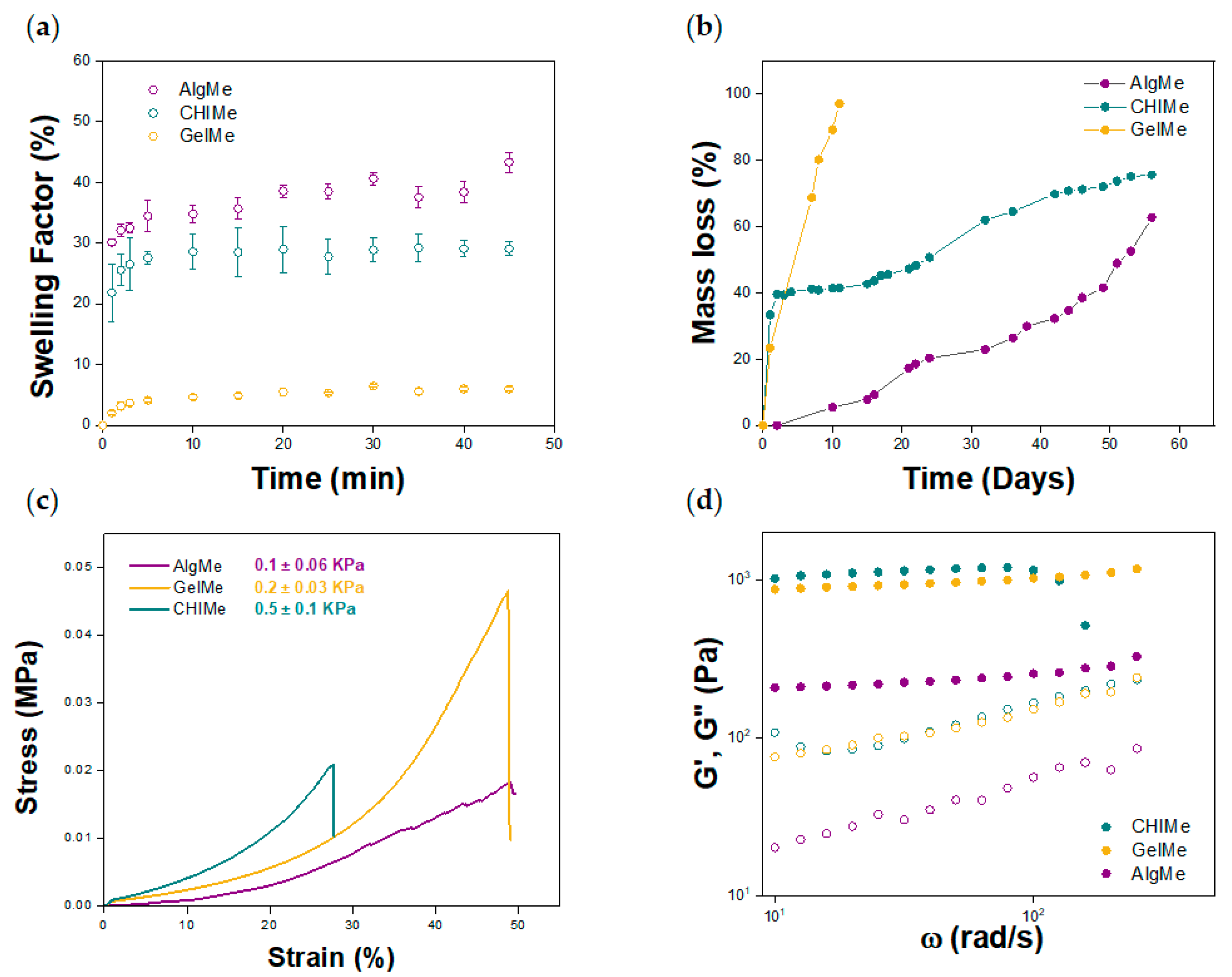 - Araiza-Verduzco, F.; Rodríguez-Velázquez, E.; Cruz, H.; Rivero, I.A.; Acosta-Martínez, D.R.; Pina-Luis, G.; Alatorre-Meda, M. Photocrosslinked Alginate-Methacrylate Hydrogels with Modulable Mechanical Properties: Effect of the Molecular Conformation and Electron Density of the Methacrylate Reactive Group. Materials 2020, 13, 534. [Google Scholar] [CrossRef]