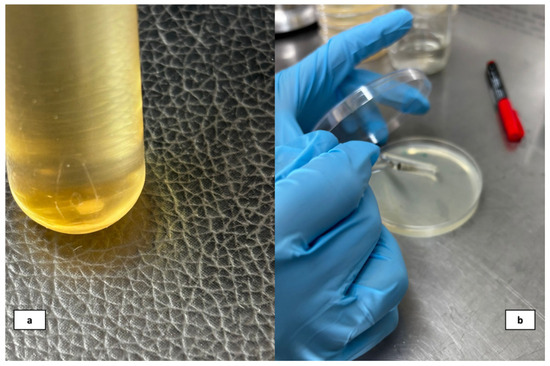 In this study, 24–36 h C. albicans strains (ATCC 10231) were utilizated to facilitate colonization on resin surfaces. Fresh cultures of C. albicans were inoculated into Sabouraud dextrose broth (SDB) medium, and a suspension containing 1–2 × 108 CFU (~0.5 McFarland) was prepared in a shaking incubator. Identical 1 × 1 × 1 mm3 pieces of acrylic and polyamide resins were immersed in this suspension at 35 °C for 1 h with continuous shaking speed of 120 rpm to promote C. albicans adherence [21]. At the end of this period, the resin pieces were removed from the suspension according to aseptic rules and gently washed with a sterile 0.9% NaCl solution [22,23].