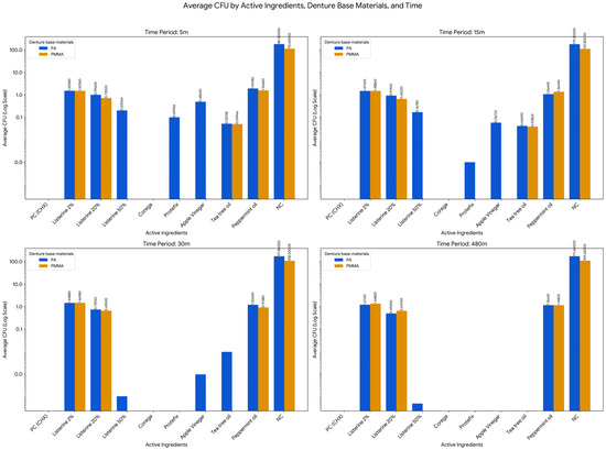 Corega emerged as the most effective cleaner for both acrylic and polyamide surfaces. C. albicans growth was prevented by 100% in a short time of 5 min, as the mean CFU value was 0 on both acrylic (PMMA) and polyamide (Deflex) surfaces at the 5 m application time. The mean CFU remained 0 for both materials at all other tested times (15 m, 30 m, 480 m). For Protefix (150 mL/1 tablet), the mean CFU value for Acrylic (PMMA) was 0 at all times6. For polyamide (Deflex), the mean CFU was 0.1 at 5 m and 0.001 at 15 m, before reaching 0 at 30 m and 480 m. It was not necessary to leave the dentures in Corega and Protefix overnight, as specified in the product instructions. Natural agents like tea tree oil and apple vinegar also achieved strong inhibition—but required longer exposure times, particularly on polyamide. For apple vinegar (15%), the mean CFU was 0 at all times on acrylic (PMMA), and the mean CFU was 0.486 at 5 m, 0.057 at 15 m, and 0.001 at 30 m, reaching 0 only at 480 m on polyamide (Deflex). For tea tree oil (2%), the mean CFU was 0 at 30 m on acrylic (PMMA), the mean CFU reached 0 at 480 m on polyamide (Deflex). Peppermint oil, in contrast, showed inconsistent and limited antifungal activity. Its mean CFU values remained high; ranging from 1.565 to 1.148 on acrylic (PMMA) and from 1.902 to 1.156 on polyamide (Deflex) across the tested application times.