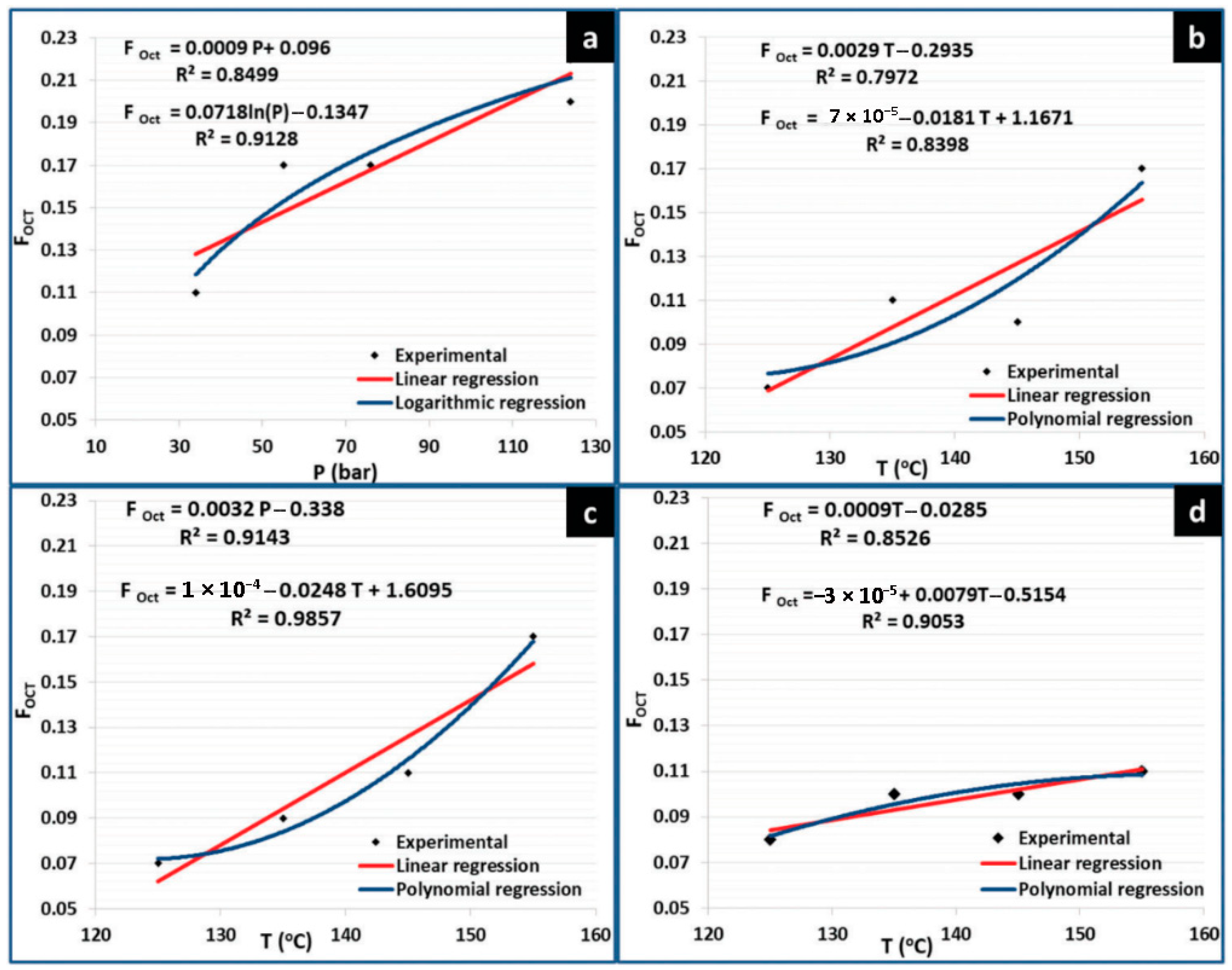 Figure 4. Copolymerization of GMA and Oct in CO2 as a reaction medium: influence of (a) pressure and (bd) temperature on the olefin copolymer composition (FOct). Reprinted with permission from Rosales-Guzmán M. [24].