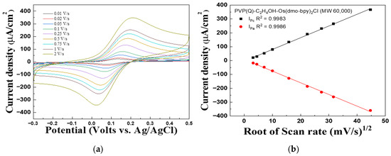 (a) Cyclic voltammograms and (b) Calibration curve vs. the square root of the scan rate for the PVP(Q)-C2H4OH-Os(dmo-bpy)2Cl (MW 60,000).