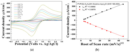 (a) Cyclic voltammograms and (b) Calibration curve vs. square root of the scan rate for the PVP(Q)-C2H4OH-Os(dmo-bpy)2Cl (MW 160,000).