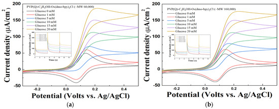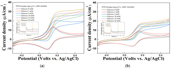 Cyclic voltammogram of different glucose concentrations of PVP-Os(dmo-bpy)2Cl (MW 60,000 (a)/160,000 (b)). (inset) The MPS results of PVP-Os(dmo-bpy)2Cl (MW 60,000 (a)/160,000 (b)) for the detection of various glucose concentrations(0–20 mM) in 1× PBS.