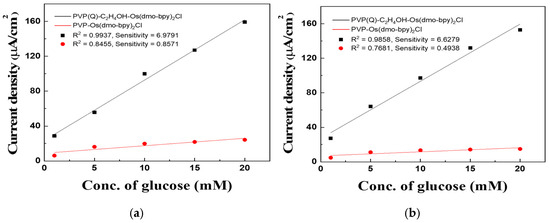 (a) Calibration curve between PVP(Q)-C2H4OH-Os(dmo-bpy)2Cl (MW 60,000) (Black line) and PVP-Os(dmo-bpy)2Cl (MW 60,000) (Red line) at 0.2 V. (b) Calibration curve between PVP(Q)-C2H4OH-Os(dmo-bpy)2Cl (MW 160,000) (Black line) and PVP-Os(dmo-bpy)2Cl (MW 160,000) (Red line) at 0.2 V.