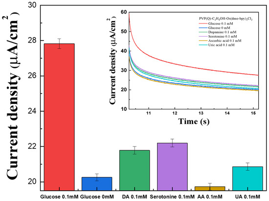 Bar graph for the interference effect of glucose (red), DA (green), serotonin (violet), AA (brown), and UA (cyan) in 1× PBS. (inset) The MPS results for the interference effect of glucose (red), DA (green), serotonin (violet), AA (brown), and UA (cyan) with the PVP(Q)-C2H4OH-Os(dmo-bpy)2Cl (MW 160,000).