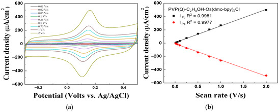 Figure 8 shows the scan rate dependence of the PVP(Q)-C2H4OH-Os(dmo-bpy)2Cl/GDH/Silane/Au electrodes, recorded in the range of 0.01–2 V/s, to evaluate their performance as electron transfer mediators and investigate the diffusion behavior. The cathodic peak current (Ipc) and anodic peak current (Ipa) exhibited excellent linearity with the correlation coefficients of R2 = 0.9981 and R2 = 0.9977, respectively.