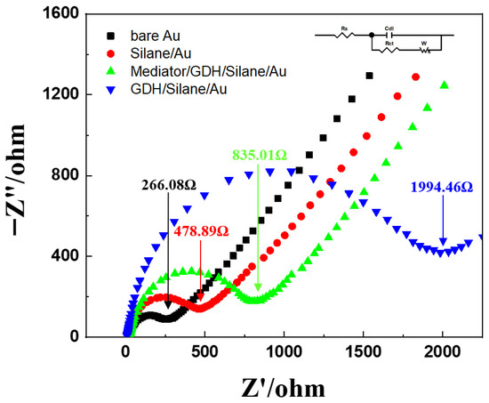 Electrochemical impedance spectroscopy (EIS) of the bare Au electrode (black), silane-treated Au electrode (red), Mediator/GDH/Silane/Au electrode (green), and GDH/Silane/Au electrode (blue).