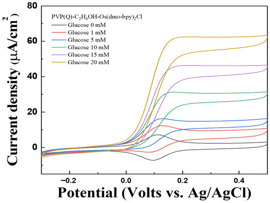 The performance of PVP(Q)-C2H4OH-Os(dmo-bpy)2Cl as an electron transfer mediator was assessed using CV and MPS measurements at various glucose concentrations (0, 1, 5, 10, 15, and 20 mM in 1× PBS) using PVP(Q)-C2H4OH-Os(dmo-bpy)2Cl/GDH/Silane/Au electrodes (MW 160,000). The electrodes exhibited distinct and stable catalytic current responses across the tested glucose concentrations, as shown in Figure 10 and Figure 11a.