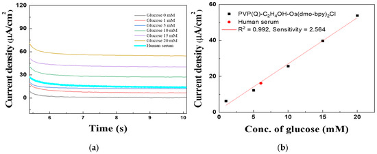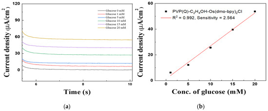 (a) MPS results of Au electrodes/GDH/Silane/PVP(Q)-C2H4OH-Os(dmo-bpy)2Cl (MW 160,000) for the detection of various glucose concentrations (0–20 mM). (b) Calibration curve of the corresponding relationship between current density and glucose concentration at 0.2 in (a).
