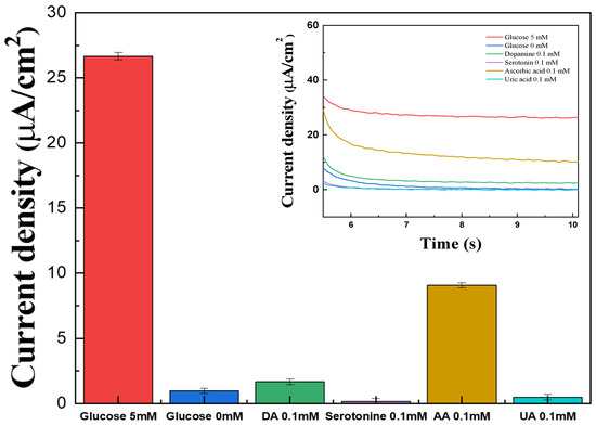 The interference effects of common electroactive species present in blood were investigated using the fabricated electrodes by MPS measurements. Representative interferents AA, DA, UA, and serotonin were prepared at 0.1 mM in 1× PBS, while glucose solutions were prepared at 0 mM and 0.1 mM. A 40 μL volume of each solution was applied to the electrode surface for testing.
