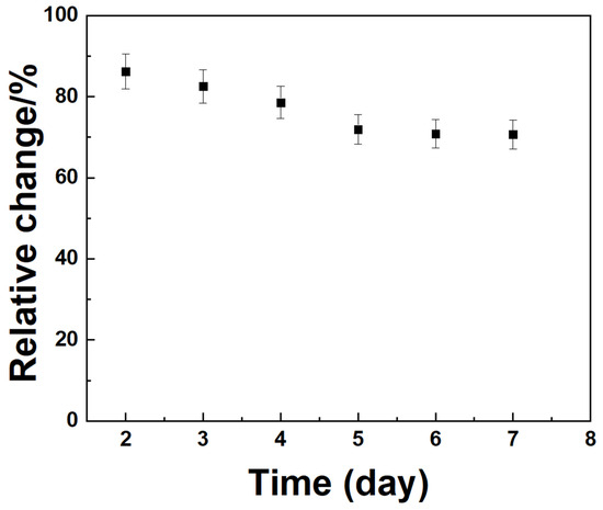 Figure 13 shows the amperometric I–t responses obtained to evaluate the long-term stability of the Mediator/GDH/Silane/Au electrodes for CGM. The measurements were taken in a 5 mM glucose solution over seven days. The results showed that the oxidation current decreased by approximately 18% from the initial enzyme activity to that measured on day 7, suggesting that the electrodes retained a substantial portion of their catalytic activity and showed good operational stability over the testing period.