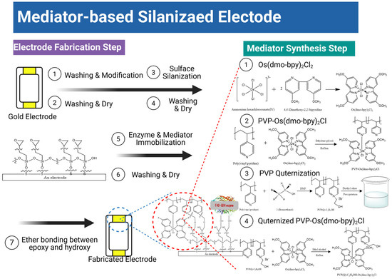 Mediator/GDH immobilization: For SPCEs, mediator/GDH/PEGDGE mixtures (4:4:1 v/v) were prepared using mediator (10 mg/mL), GDH (40 mg/mL), and PEGDGE (10 mg/mL). A 10 μL aliquot was drop-cast on SPCEs, dried at 30 °C for 30 min, and stored in a desiccator for 24 h. For the silane/Au electrodes, mediator/GDH/PEGDGE mixtures (1 mg/mL mediator, 10 mg/mL GDH, 10 mg/mL PEGDGE) were similarly prepared, drop-cast (10 μL), oven-dried (30 °C, 30 min), desiccated (24 h), ultrasonicated in PBS to remove the physisorbed species, and finally dried under nitrogen [25]. The detailed reaction mechanism and corresponding process are summarized in Scheme 1.