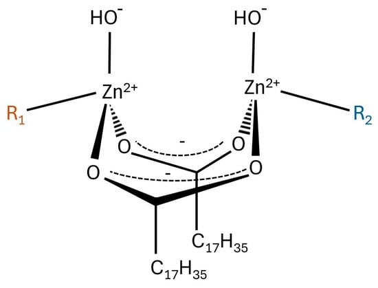 Considering the vulcanization, there is a lot of information in the literature about ZnO and StA complex formation. Scotti [12] prepared an extensive review, which indicated that stoichiometric ZnSt is not an efficient activator of sulfur vulcanization. However, Junkong et al. [14] observed that non-stoichiometric salts of ZnO and fatty acids can effectively activate vulcanization. It was found that, at high temperatures, a dominant structure of the product formed in the ZnO and StA reaction was a bridging bidentate zinc/stearate complex with a molar ratio of 2:2. It involved two zinc ions bridged by two stearate (StA) ligands, where each stearate molecule coordinated to both zinc ions with its carboxylate group. This structure was represented as (Zn2(μ-O2CC17H35)2)2+(OH–)2·R1R2, where R1 and R2 can be water molecules or rubber segments, respectively. The most likely structure of the binuclear type bridging bidentate zinc/stearate complex is presented in Figure 1 [17].