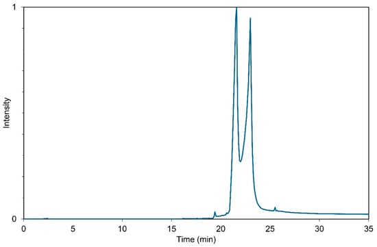 The TD-GC-MS chromatogram presented in Figure 2 confirmed the compliance of the material with the manufacturer’s declaration. The first peak (~21 min) corresponds to palmitic acids and the second (~23 min) to stearic acid. There are visible traces of shorter and longer carboxylic acids on the chromatogram as well.