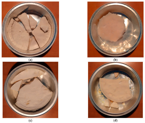 While heating the components of the mixtures presented in Table 1, the synthesis reaction of ZnSt was observed, along with the release of water. In the case of active ZnO, this process was much more turbulent than for standard ZnO. In the case of samples with added sulfur, it was observed that the mixture delaminated due to the separation of melted sulfur in the lower part of the reaction flask. The prepared synthesis products were poured into aluminum containers and left to cool. The obtained products are presented in Figure 4.