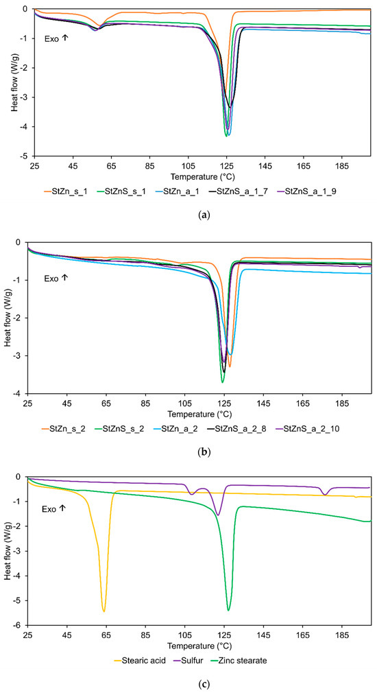 DSC results for synthesis products described in Table 1: (a) stoichiometric; (b) non-stoichiometric; (c) raw materials, i.e., commercial StA, S, and ZnSt.