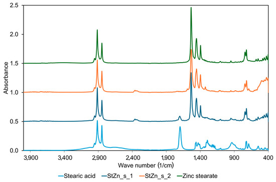 The transitions of substrates into zinc salts in the reactive mixtures were checked using FTIR Spectroscopy. The FTIR spectra of StA used for the synthesis and commercial ZnSt were collected to compare them with those obtained for the reaction products prepared in stoichiometric (StZn_s_1) and non-stoichiometric (StZn_s_2) conditions (Figure 6). Regarding the FTIR spectrum for StA, the absorption peaks at about 2915 and 2849 cm−1 in the high-frequency region were attributed to −CH2− asymmetric and symmetric stretching vibrations, respectively. They were accompanied by stretching vibrations of the −CH2- band at a wave number of approximately 1472 cm−1 [25]. Furthermore, the strong and sharp peak at approximately 1700–1710 cm−1, characteristic of the C=O stretching vibrations in the carboxylic acid group, and peaks at 1300–1420 cm−1, characteristic of the O-H bending vibrations of the hydroxyl group in carboxylic acids, were observed. In addition, peaks corresponding to −C–O stretching vibrations in −COOH were identified in the wave number range of 930–1100 cm−1 [26]. It should be noticed that, in both spectra for synthesized products, the band at a wave number of approximately 1700 cm−1 characteristic for the double bond between carbon and oxygen in carboxylic acids, i.e., C=O band, changed to a sharp peak at approximately 1535 cm−1, which is typical for asymmetric stretching vibrations of −COO− in carboxylate salts, accompanied by sharp peaks corresponding to symmetric stretching vibrations of −COO− at approximately 1400–1450 cm−1 [26]. This confirmed that a reaction took place between ZnO and stearic acid, and a carboxylic acid salt was formed. On the spectrum of StZn_s_1, it is also visible that a part of StA remained unreacted, since the small peak at approximately 1700–1710 cm−1, characteristic of the C=O stretching vibrations in the carboxylic acid group, is still present. On the other hand, in the FTIR spectrum of StZn_s_2, the presence of non-reacted ZnO can be concluded, since the intensity of the peak at a wave number of approximately 400–600 cm−1, which is typical for Zn–O stretching vibrations [27], is higher compared to the FTIR spectrum of the product synthesized in stoichiometric conditions, i.e., StZn_s_1 or pure ZnSt. The intensity of the bands in this wave number range is higher than for the product synthesized in stoichiometric conditions, even though this is already the limit of the measuring range of the device. Due to fact that, in this range of wave numbers, the absorbance is imposed with a ZnSt answer, i.e., Zn-O stretching, which confirms metal–oxygen bonding, it is difficult to determine the presence of unreacted ZnO for ZnSt_s_1. There is no difference in the spectra of ZnSt_s_1 and ZnSt_s_2 other than the lack of bands at 1700 cm−1 (typical for C=O group in carboxylic acids) and approximately 420 cm−1 (typical for Zn-O vibrations) in the spectrum of ZnSt_s_2. This observation supports the findings concluded based on DSC results that only carboxylic acids salts were formed without non-stoichiometric complexes.