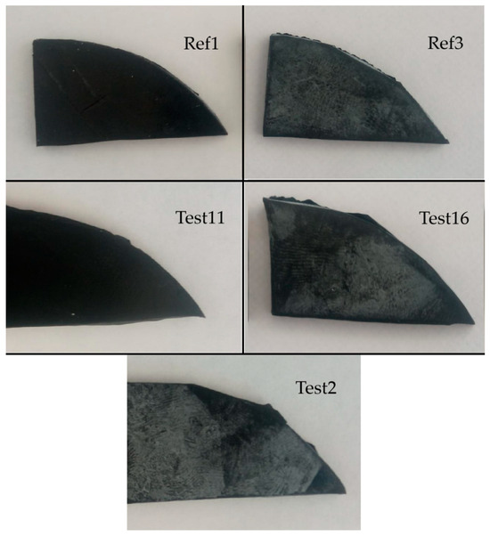 The reference vulcanizate Ref0 with standard ZnO exhibited the lowest tensile strength (TS) and elongation at break (Eb). It should be noted that the Eb of this vulcanizate was approximately 120%, while for most other vulcanizates the Eb was above 400%. This indicates a very low elasticity of this vulcanizate compared to the others, which may be caused by its significantly higher degree of cross-linking. The vulcanizate with active ZnO (Ref1) showed twice the TS compared to that with standard ZnO, and a significantly better elasticity (Eb of approximately 500%). The vulcanizate with ZnSt (Ref3) also showed better tensile parameters, i.e., TS and Eb, compared to that with standard ZnO, despite having a 3-fold lower zinc equivalent. Most importantly, vulcanizates containing the synthesized zinc complexes exhibited a significantly higher TS and Eb than vulcanizates with standard (Ref0) or active ZnO (Ref1). Surprisingly, vulcanizates with a 13.6-times lower zinc amount (Test9 and 14) compared to the reference samples showed much better tensile properties despite a significantly higher equilibrium swelling and, consequently, lower cross-linking degree. This allowed us to assume that the ZnO-containing vulcanizates were slightly over-cross-linked compared to those containing synthesis products, which caused a deterioration of their TS and an increase in their brittleness. On the other hand, a high amount of StA in rubber compounds creates a huge issue to solve, i.e., the whitening of vulcanizates (blooming) [28]. With time, additives like the zinc salts of fatty acids migrate on the surface of vulcanizates, causing visual aspects and influencing the adhesion [29]. A higher content of StA in the recipe of rubber compounds results in a higher amount of ZnSt in the vulcanizates. In Figure 7 the problem is presented for the vulcanizates containing active ZnO with the standard amount of StA (Ref1), the reference with ZnSt (Ref3), Test16 with an StA equivalent about 5-times higher than in Ref1, Test2 with StA equivalent 6.7-times higher than in Ref1, and Test11 with an StA equivalent 2-times higher than in Ref1. Vulcanizates with a 2-times higher content of StA compared to Ref1, i.e., Test11, did not show any visual blooming aspects. The amount of created ZnSt in the reaction of StA with ZnO during the preparation of the rubber compound and the curing process should also be twice as high accordingly. The increasing of the ZnSt amount in the vulcanizate by a higher amount of StA led to an unacceptable migration on the vulcanizate surface (Ref3, Test2, and Test16). For rubber composites containing synthesized materials, the reduction of zinc in the amount that did not impact their functional properties was not enough. In turn, a further reduction in the zinc amount to keep the equivalent StA as in the standard rubber compound (Ref1) or not creating blooming issues (Test11) did not guarantee keeping the demanded properties of the vulcanizates.