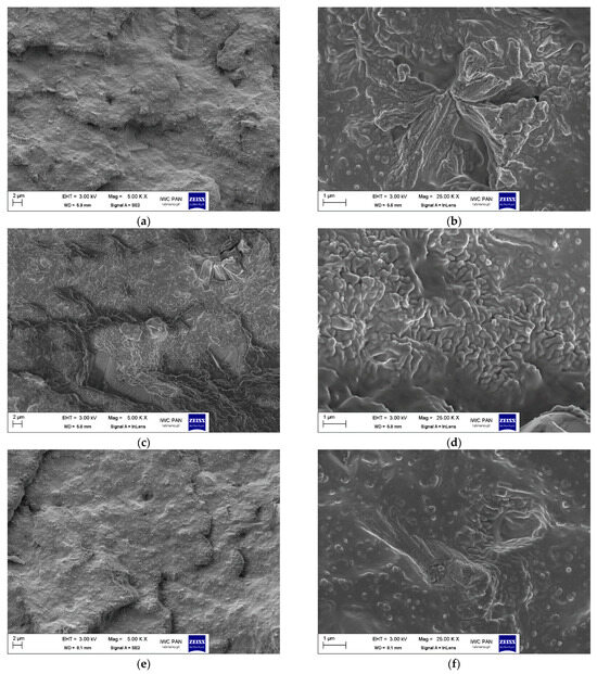 Parts of vulcanizates were examined using SEM to check whether their composition or the method of introducing the crucial cross-linking components (ZnO, StA, sulfur, ZnSt) separately or as products of the reaction influences their dispersion in the elastomer matrix. SEM images of the vulcanizate fractures are presented in Figure 8.