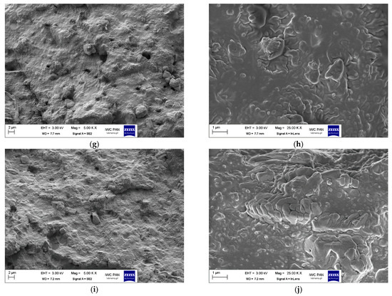 SEM images of vulcanizate fractures: (a,b) Ref1; (c,d) Test2; (e,f) Test11; (g,h) Test16; (i,j) Test18.