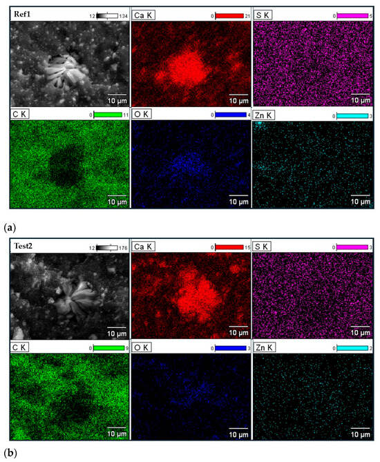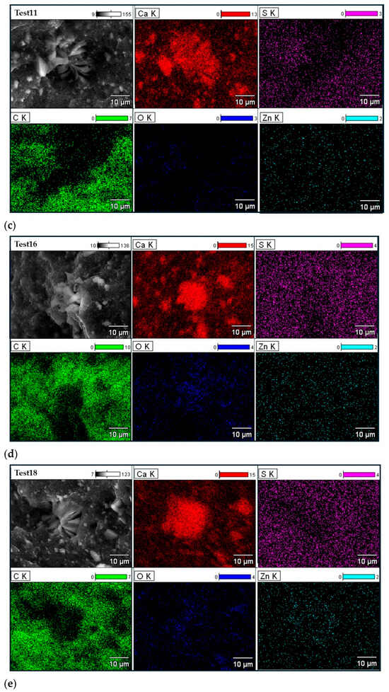 SEM images of vulcanizate fractures with EDS mapping for Ca, S, C, O, and Zn elements: (a) Ref1; (b) Test2; (c) Test11; (d) Test16; (e) Test18. Analysis of ESD mapping revealed that the agglomerates present in SEM images of the vulcanizates resulted from the agglomeration of calcium compounds present in the masterbatch composition, e.g., CaCO3. On the other hand, EDS analysis showed that components of the curing system, i.e., sulfur and zinc compounds, were homogeneously dispersed in the elastomer matrix, regardless of whether ZnO or the synthesized products obtained in the reaction of ZnO and StA under stoichiometric or non-stoichiometric conditions were used as the vulcanization activator. Hence, it can be concluded that the composition of the elastomer composite, i.e., the type and amount of the activator, did not significantly influence the general dispersion of the rubber composite components.