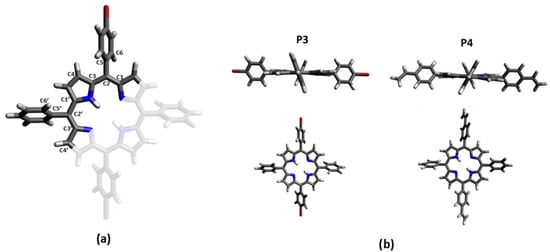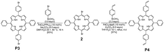 The preparation of P3 and P4 required the synthesis of meso-substituted A2B2-trans-porphyrins. In that way, we focused our attention on the use of the Suzuki–Miyaura cross-coupling reaction between diphenyl-dibromo-trans-porphyrin 2 and arylboronic acids [71,72]. Indeed, the intermediate molecule 2 could be easily obtained in a 94% yield by dibromation of 5,15-diphenylporphyrin 1 [73] with N-bromosuccinimide (NBS) in chloroform in the presence of pyridine (Figure 1) [74,75].