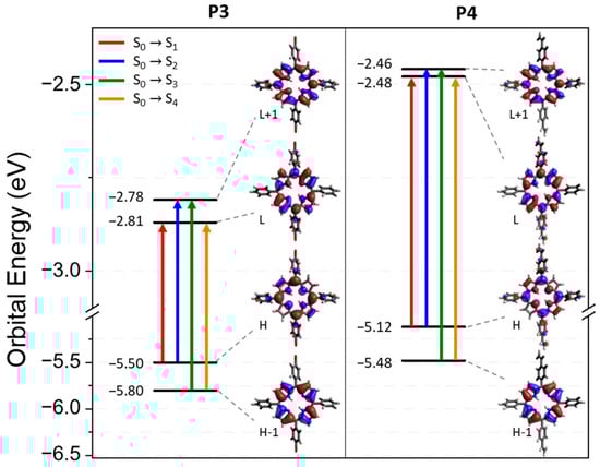 Energy levels and representation of the LUMO+1, LUMO, HOMO, and HOMO-1 orbitals for P3 and P4 from a B3LYP/6-31G(d) calculation on the ground state optimized geometry. The biggest contribution in the TD-DFT transitions from the ground state to the first four excited states is highlighted in color. Contributions are given in Table S1 in the Supplementary Information.