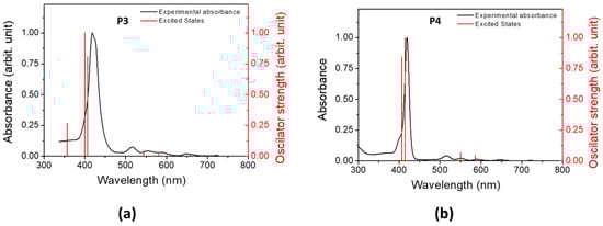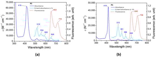The UV–visible spectrum and the normalized emission spectrum of P3 and P4 are illustrated in Figure 6. The absorbance, emission, and phosphorescence properties of both porphyrins are depicted in Table 2. The absorbance spectra of P3 and P4 present a classical π–π* transition [76]. The Soret band at 418 nm and 419 nm for P3 and P4, respectively, corresponds to the S0 S3 and S0 S4 transitions. Q bands are assigned to the S0 S1 and S0 S2 transitions, and their corresponding vibronic overtones are localized between 500 and 600 nm. The fluorescence spectrum of P3 (and P4) presents two bands, one corresponding to the S1 S0 transition and a second band at a longer wavelength resulting from the relaxation of S1 to a vibronic state of the fundamental state. The bands are separated by 1347 cm−1 and 1355 cm−1 for P3 and P4, respectively, which are in full agreement with the literature [77]. The phosphorescence spectra of P3 and P4 are displayed in Figure S7.