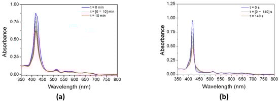 In order to highlight the photocatalytic properties of the synthesized porphyrin-based materials, a photolysis test, without any sample, was carried out. Furthermore, an adsorption test without UV light was also performed to determine if the absorbance decrease in the pollutant was only due to the adsorption of AR14 on the surface of materials.