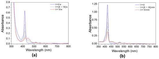 Steady-state photolysis of a DCM solution of (a) P3 and (b) P4 in the presence of MDEA after LED@405 nm irradiation. [P3] = 1.9 × 10−5 M, [P4] = 2.9 × 10−6 M, [MDEA] = 2.8 × 10−2 M.