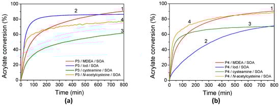 Kinetic profiles of FRP of SOA in laminate for (a) P3 and (b) P4 in the presence of (1) MDEA, (2) Iod, (3) cysteamine, and (4) N-acetylcysteine under LED@405 nm exposure.