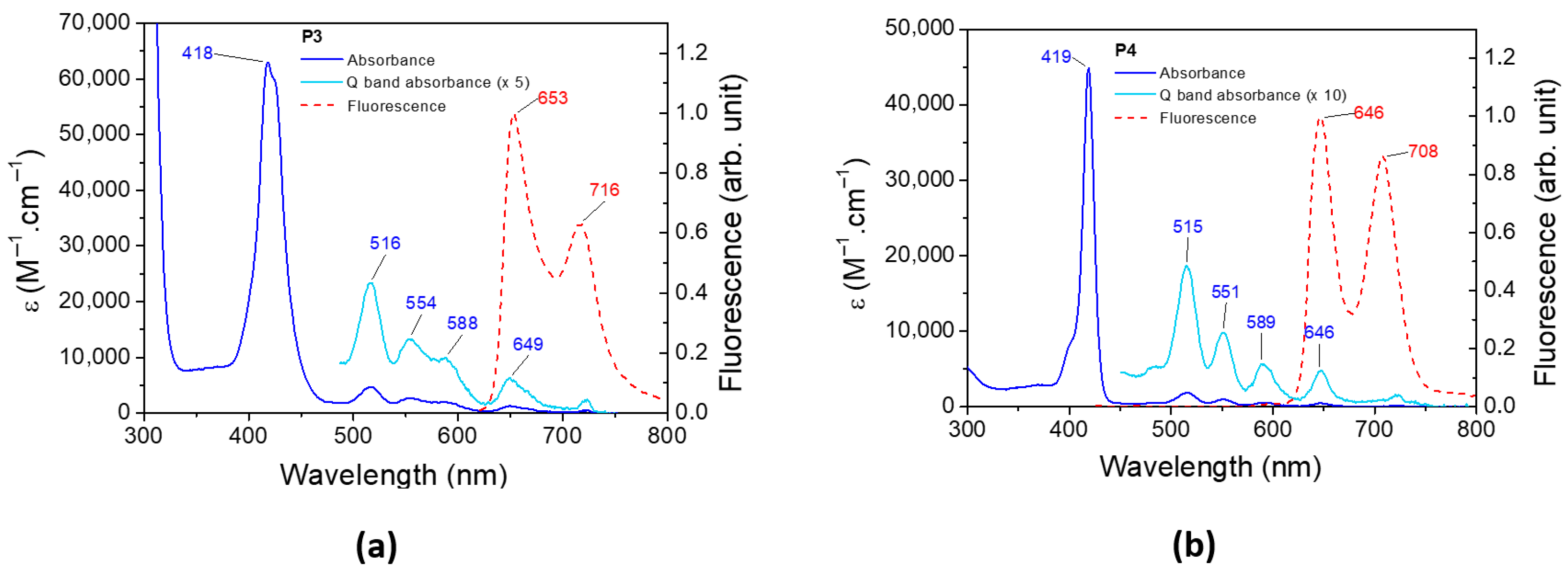 - Schnetz, F.; Knysh, I.; Jacquemin, D.; Andaloussi, S.A.; Presset, M.; Lajnef, S.; Peyrot, F.; Versace, D.-L. Porphyrin-Based Photosensitizers for Visible-Light Polymerization and Antibacterial Applications. Polym. Chem. 2024, 15, 1377–1392. [Google Scholar] [CrossRef]