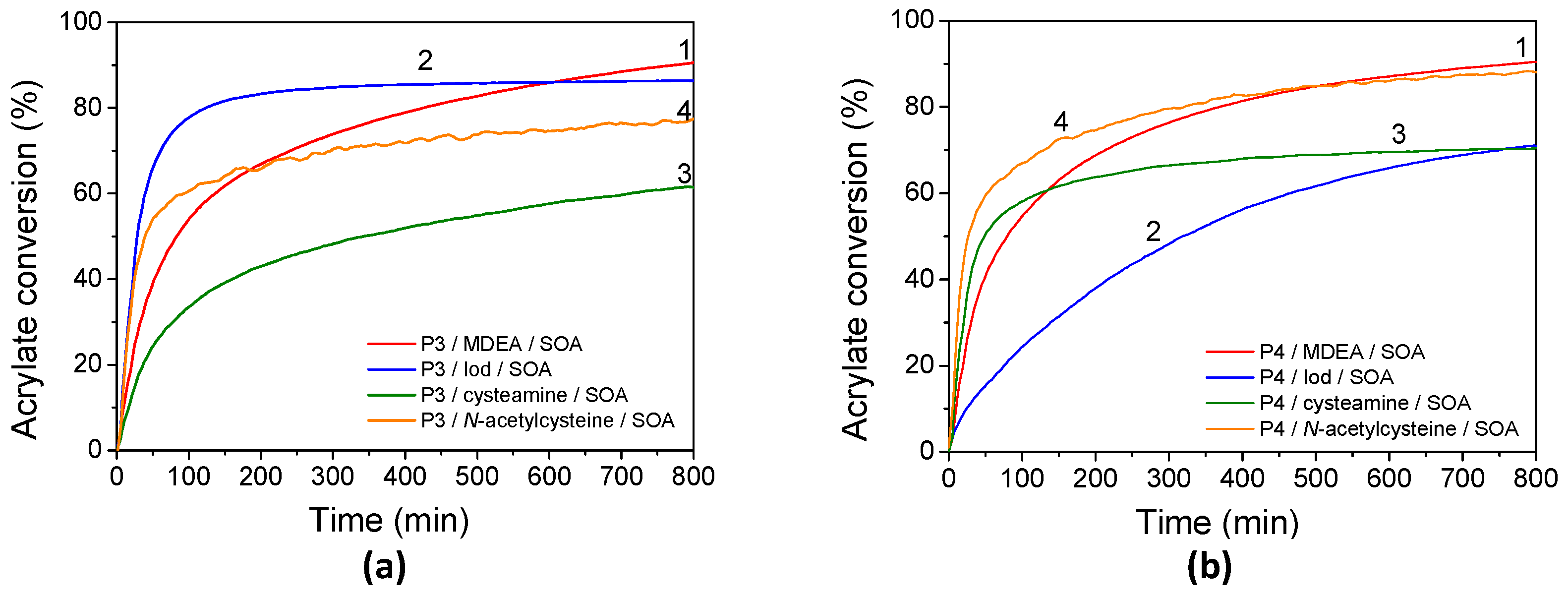 3.4. Reactivity of P3 and P4-Based Photoinitiating Systems Under Light Irradiation