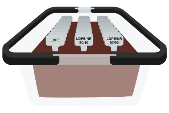 The experiment was conducted in containers measuring 40 × 50 × 35 cm, which were placed in a room with a constant air temperature of 22 ± 2 °C. The film samples were placed vertically in the soil, located in the central part of the volume, where they were kept for specified periods of time: 6, 12, 17, 24, 31, 42, and 60 months (Figure 2).